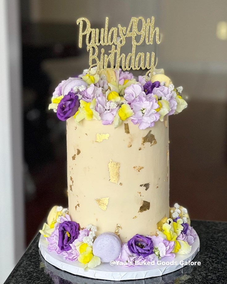 6” Vanilla and red velvet birthday cake with fresh florals, macarons and edible 24k gold leaf