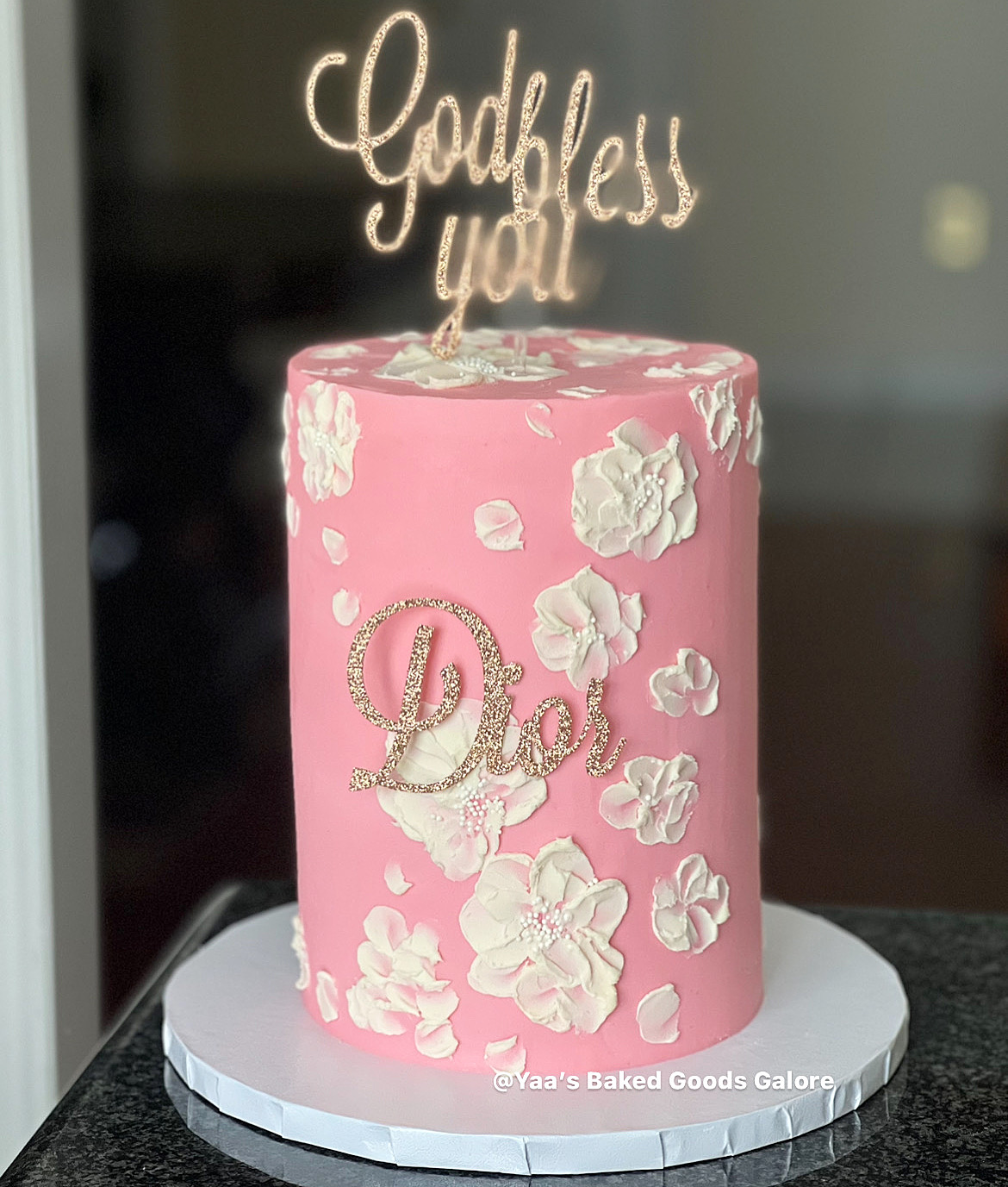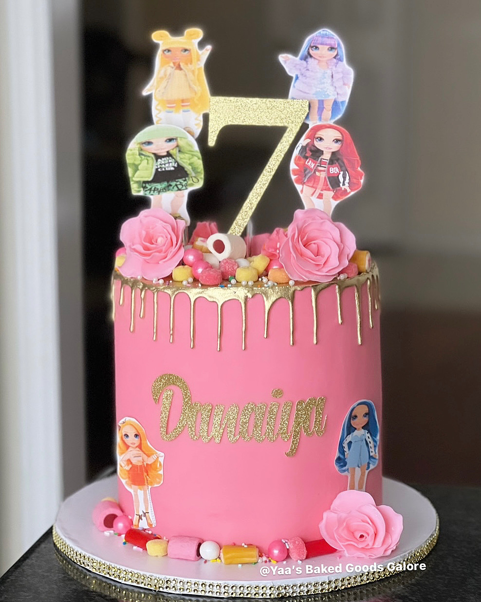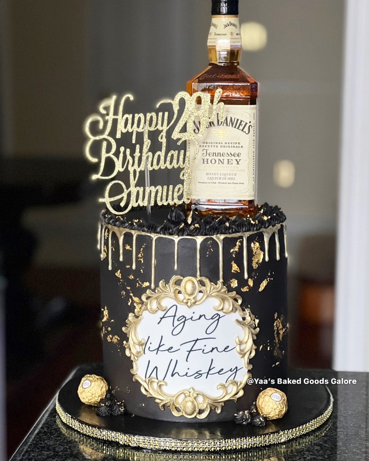8” Red velvet drip cake with Jack Daniel’s honey on top, hints of 24k gold leaf and edible image signature in front