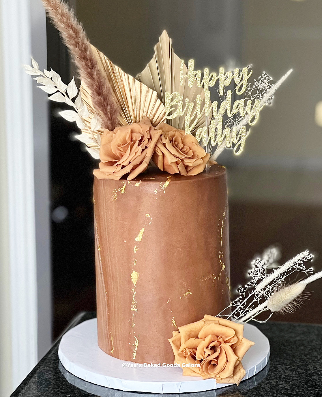 6” Vanilla marble fondant cake with dried flowers, palm fans and fresh roses