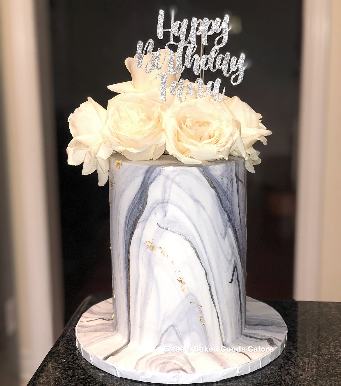 6” Vanilla marble fondant cake with highlights, edible 24k gold leaf and fresh roses