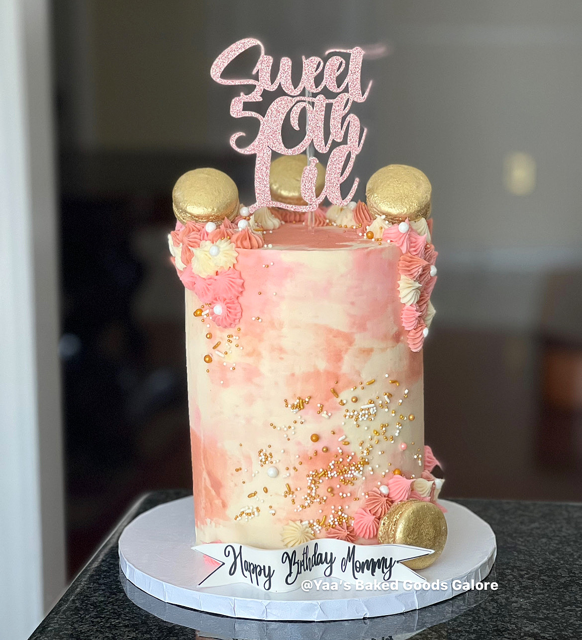 6” Vanilla birthday cake with icing drops, sprinkles and macarons