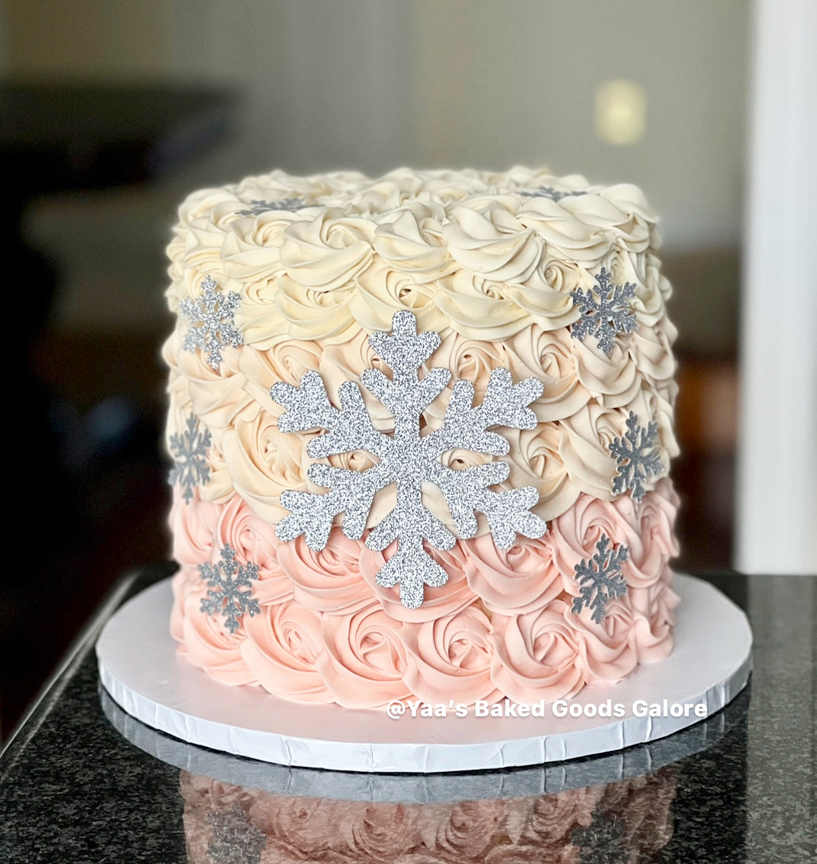 8” Vanilla baby shower cake with buttercream rosettes and snowflakes