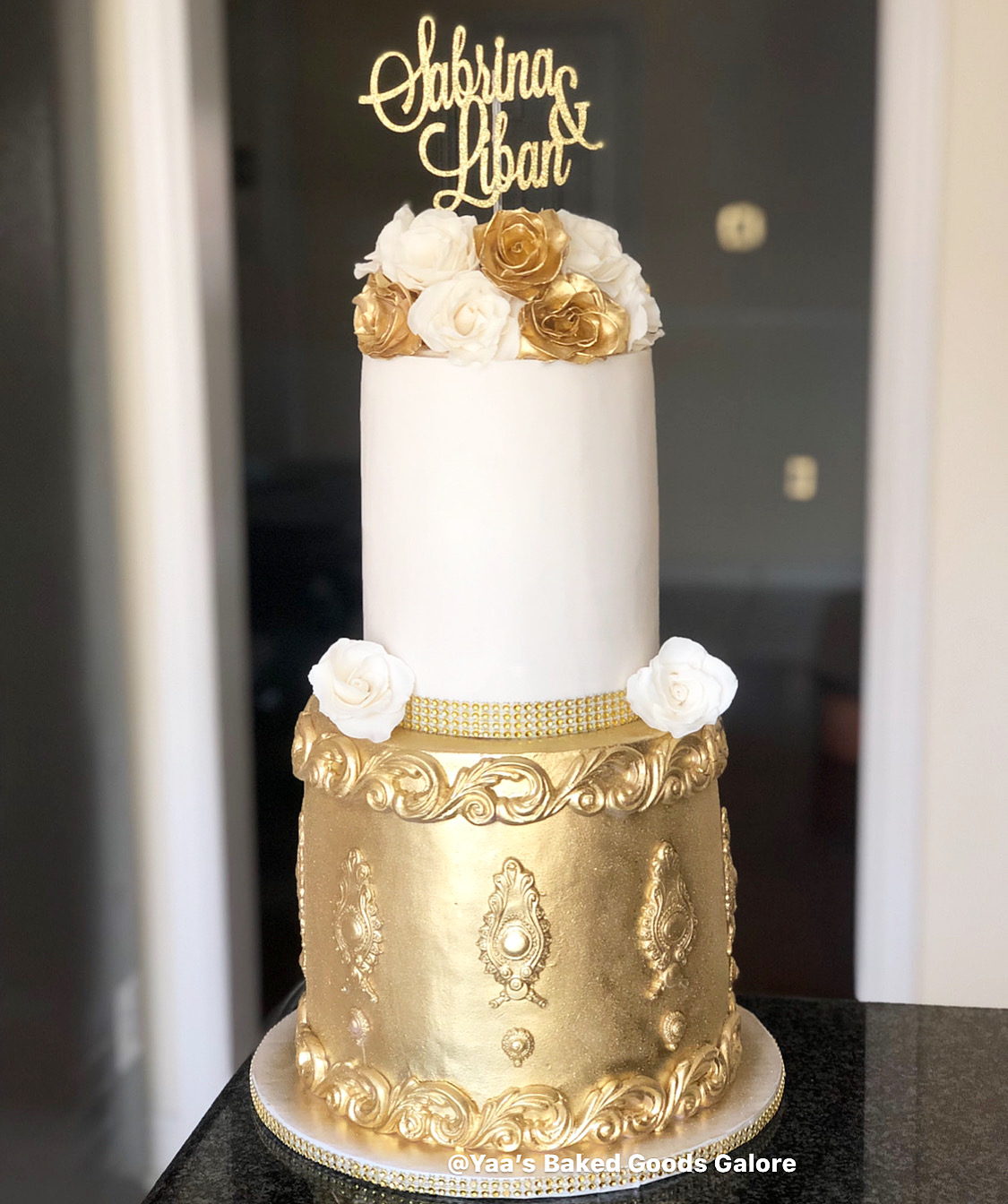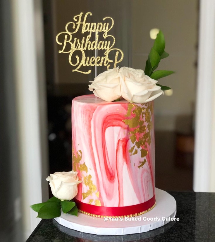 6” Vanilla and Red velvet marble fondant cake with hints of edible 24k gold leaf and fresh roses