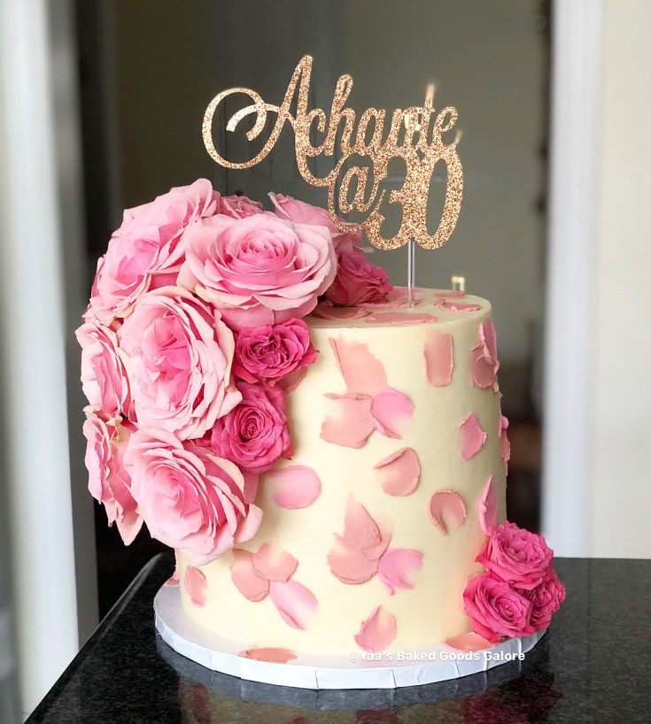 8” Carrot custom birthday cake with icing strokes and fresh roses