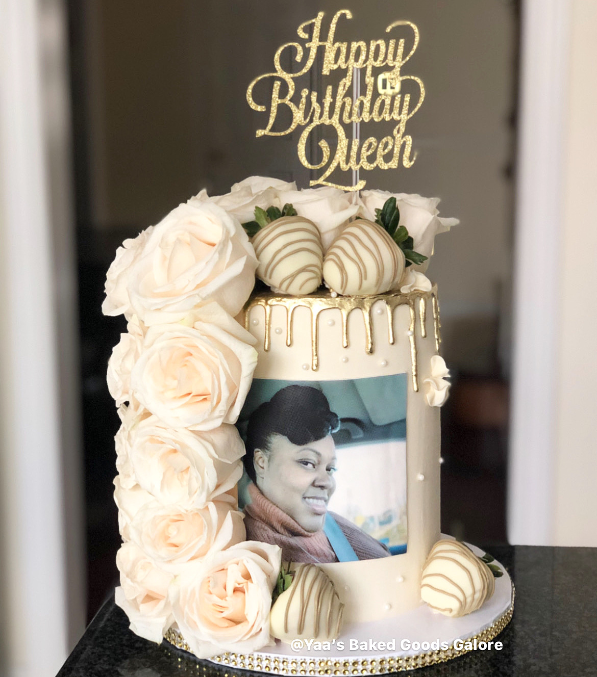 6” Vanilla and Chocolate YBGG signature design: cascading fresh roses and chocolate covered strawberries with an edible image in front