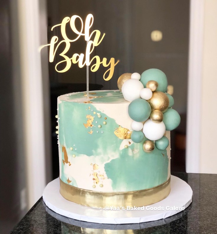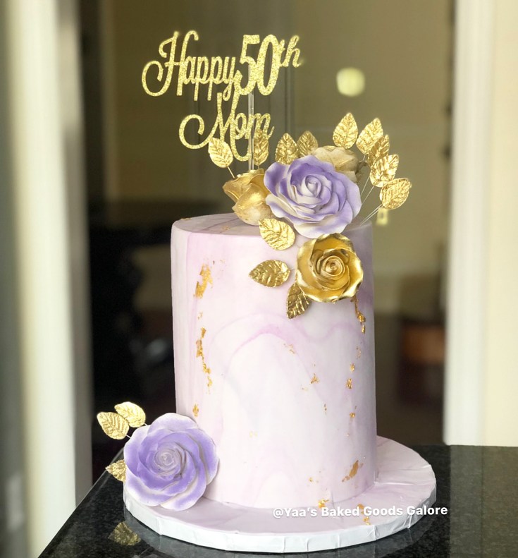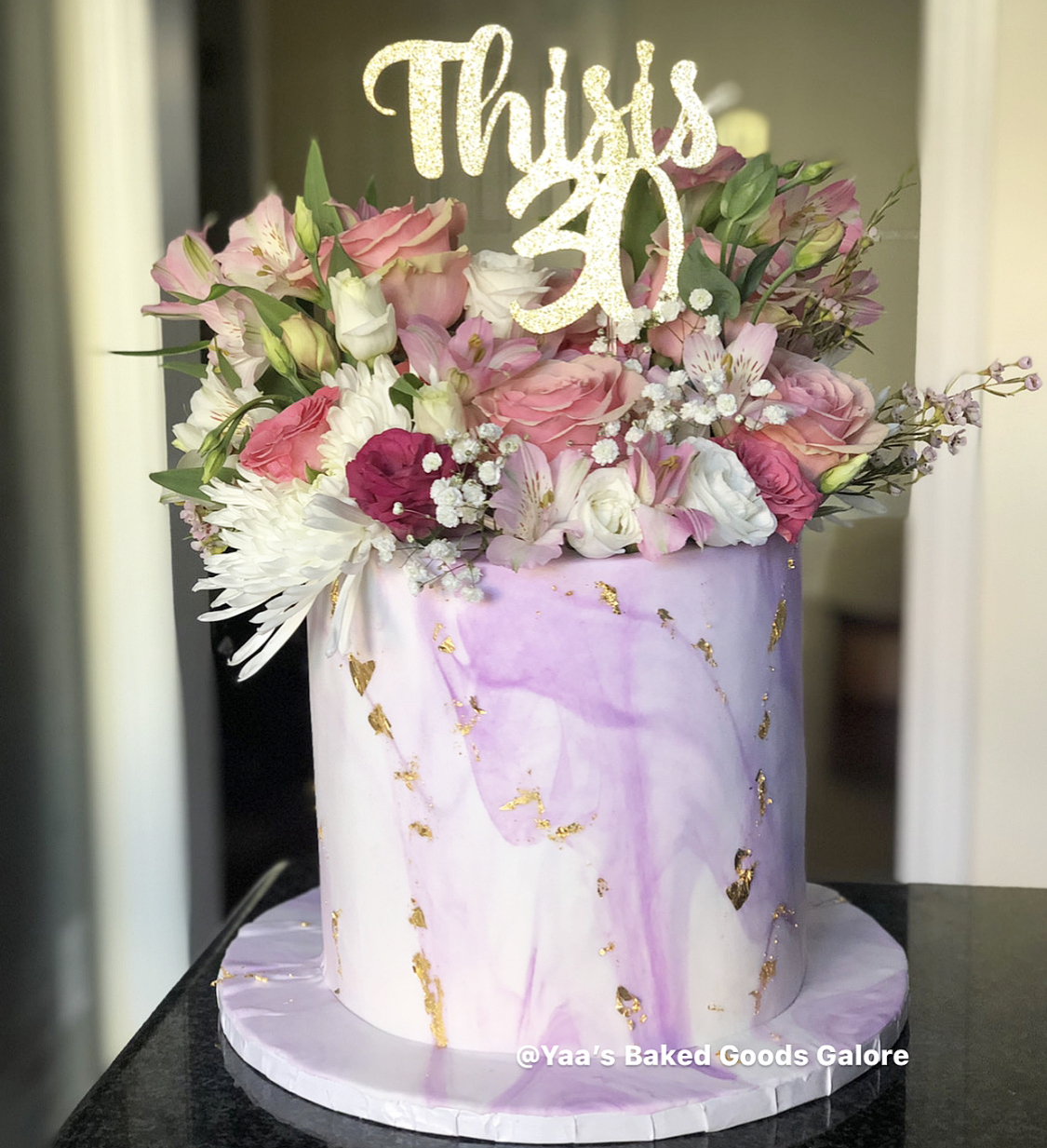 6” Vanilla marble fondant cake with an assortment of fresh flowers and hints of 24k gold leaf