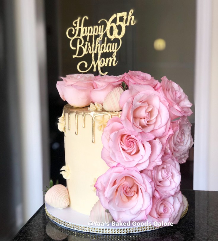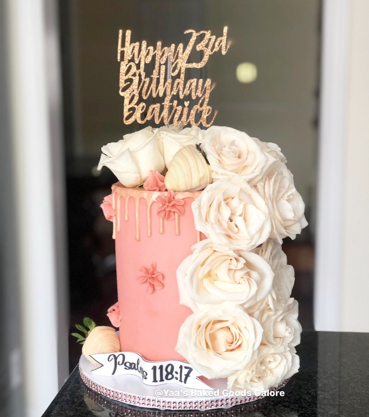 8” Vanilla drip cake with fresh roses and chocolate covered strawberries