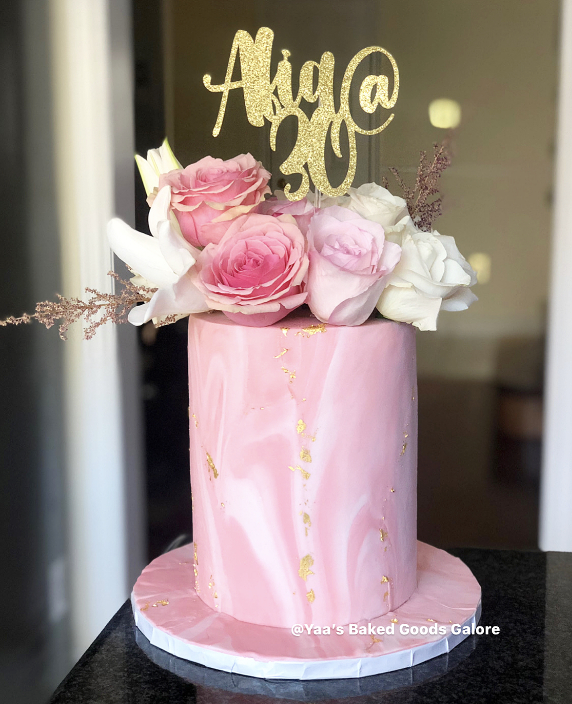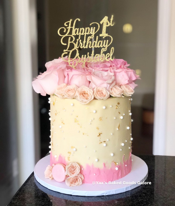 8” Vanilla birthday cake with fresh roses, pearls and hints of edible 24k gold leaf