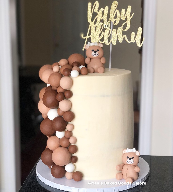 8” 4 layer semi naked baby shower cake with handmade fondant teddy bears and balls