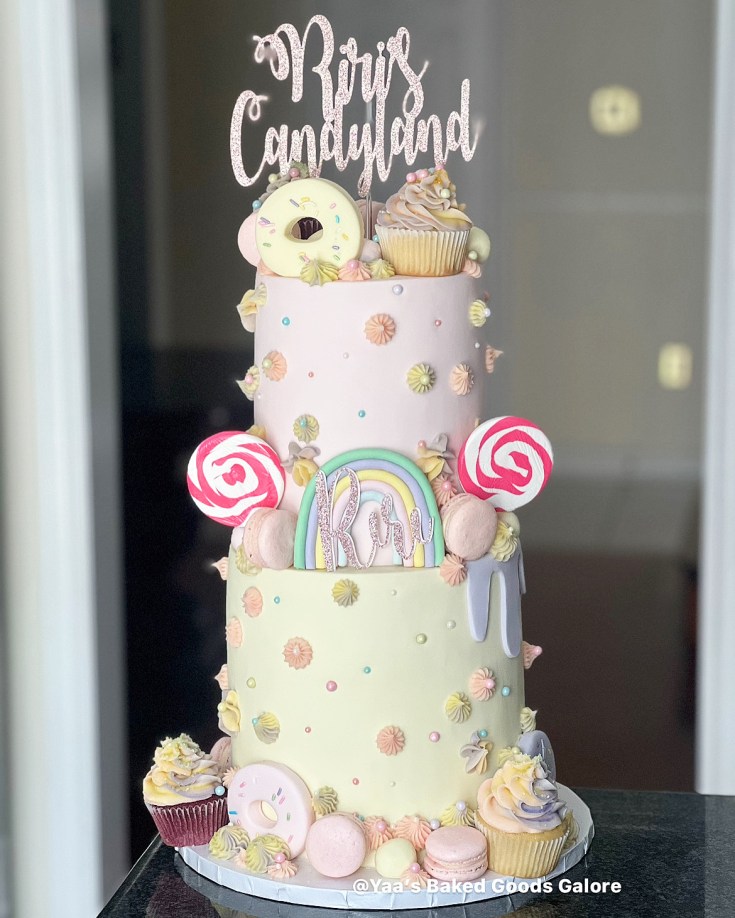 6” + 8” Vanilla and Red velvet 2 tier candyland theme birthday cake with all edible fondant details and cupcakes