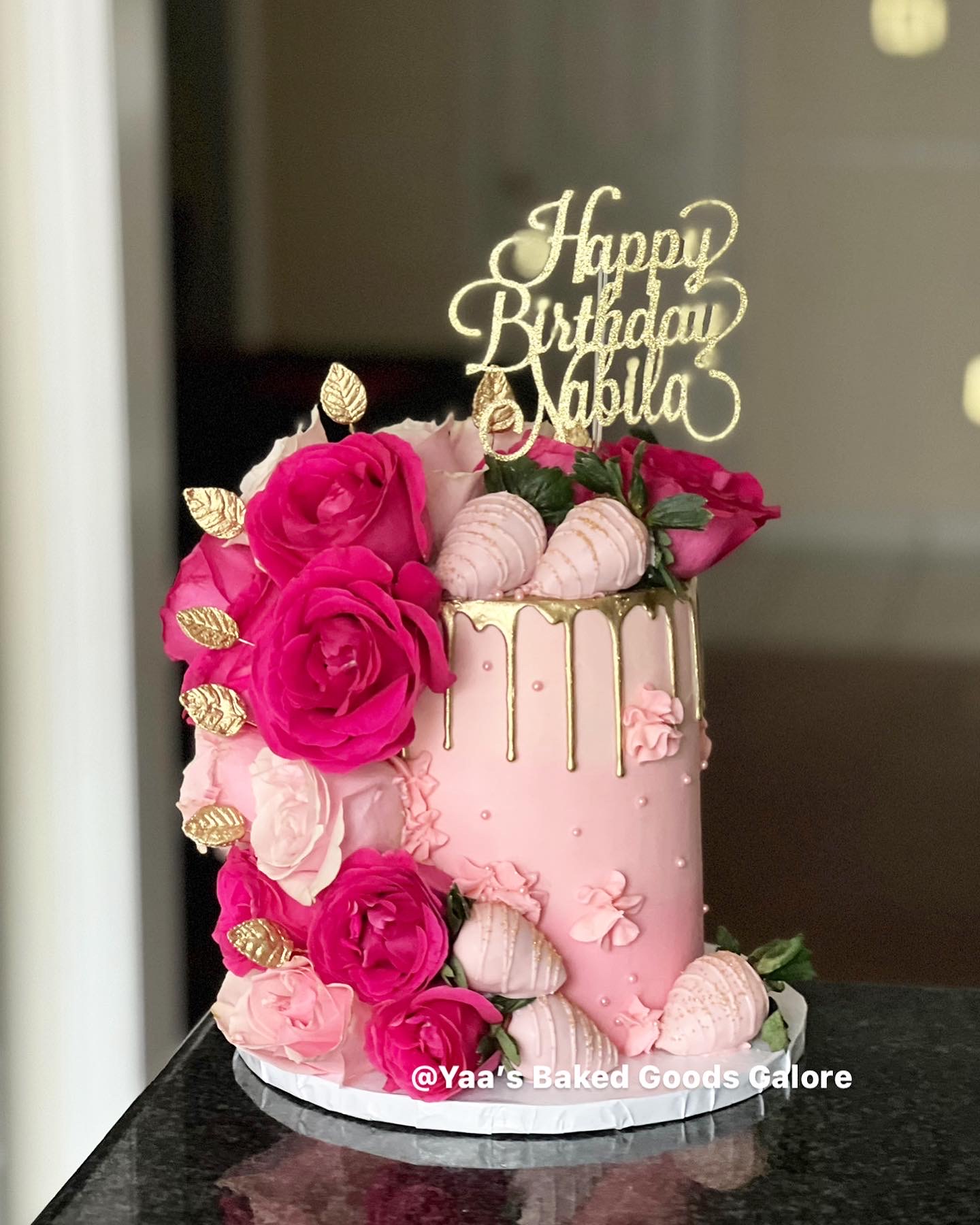 6” Red velvet drip cake with fresh roses and chocolate covered strawberries