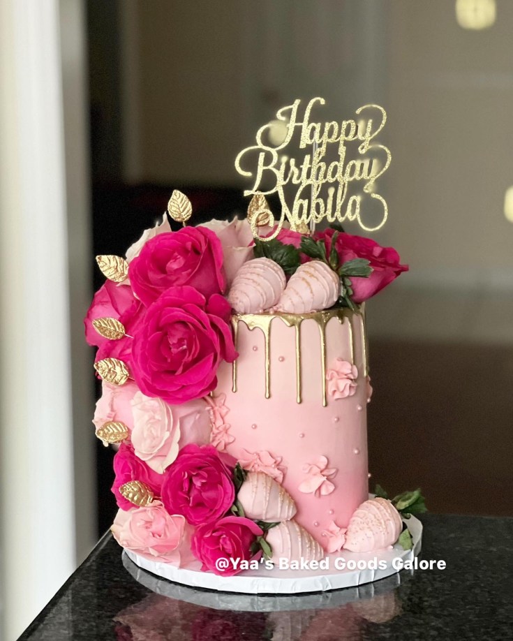 6” Vanilla fondant birthday cake with a drip, edible silver leaf and a variety of fresh flowers