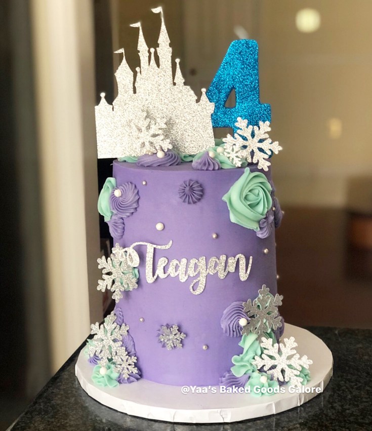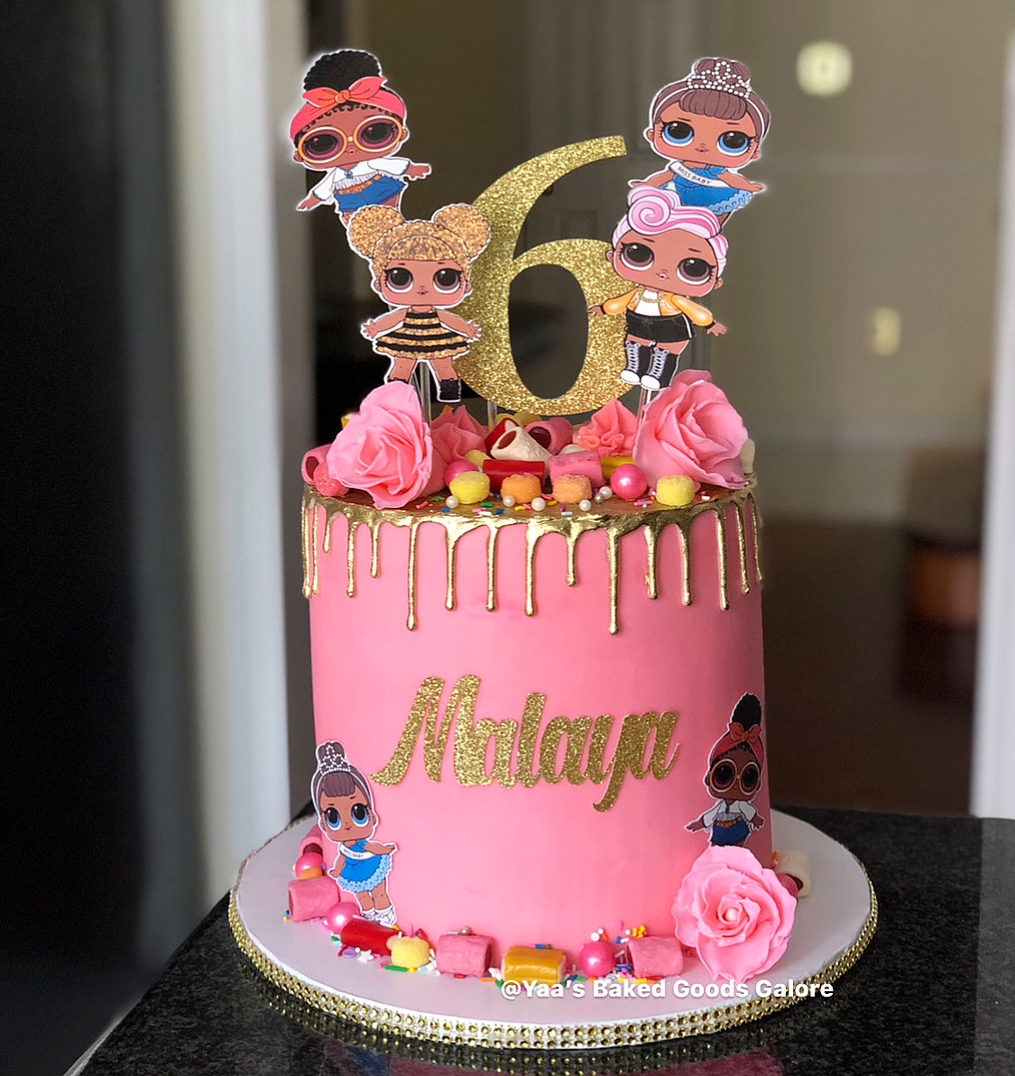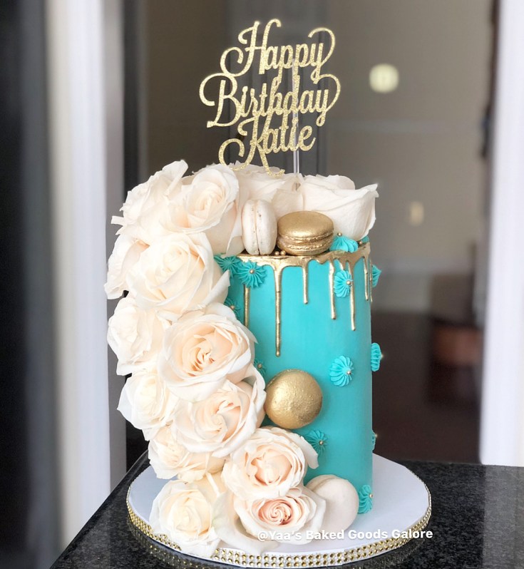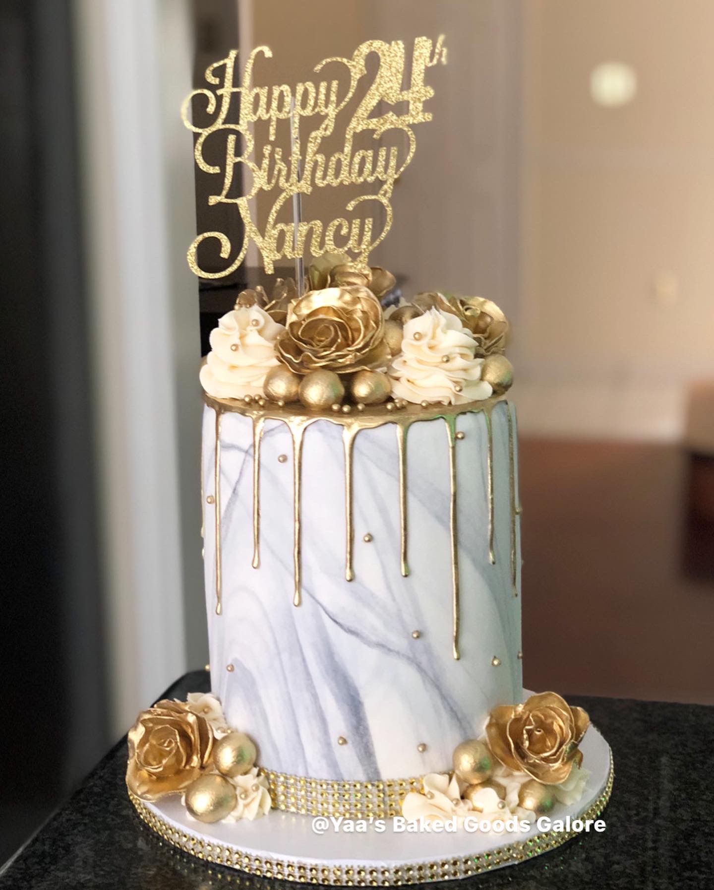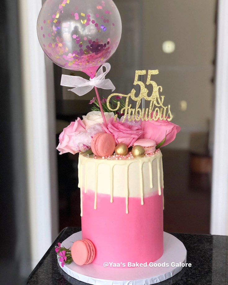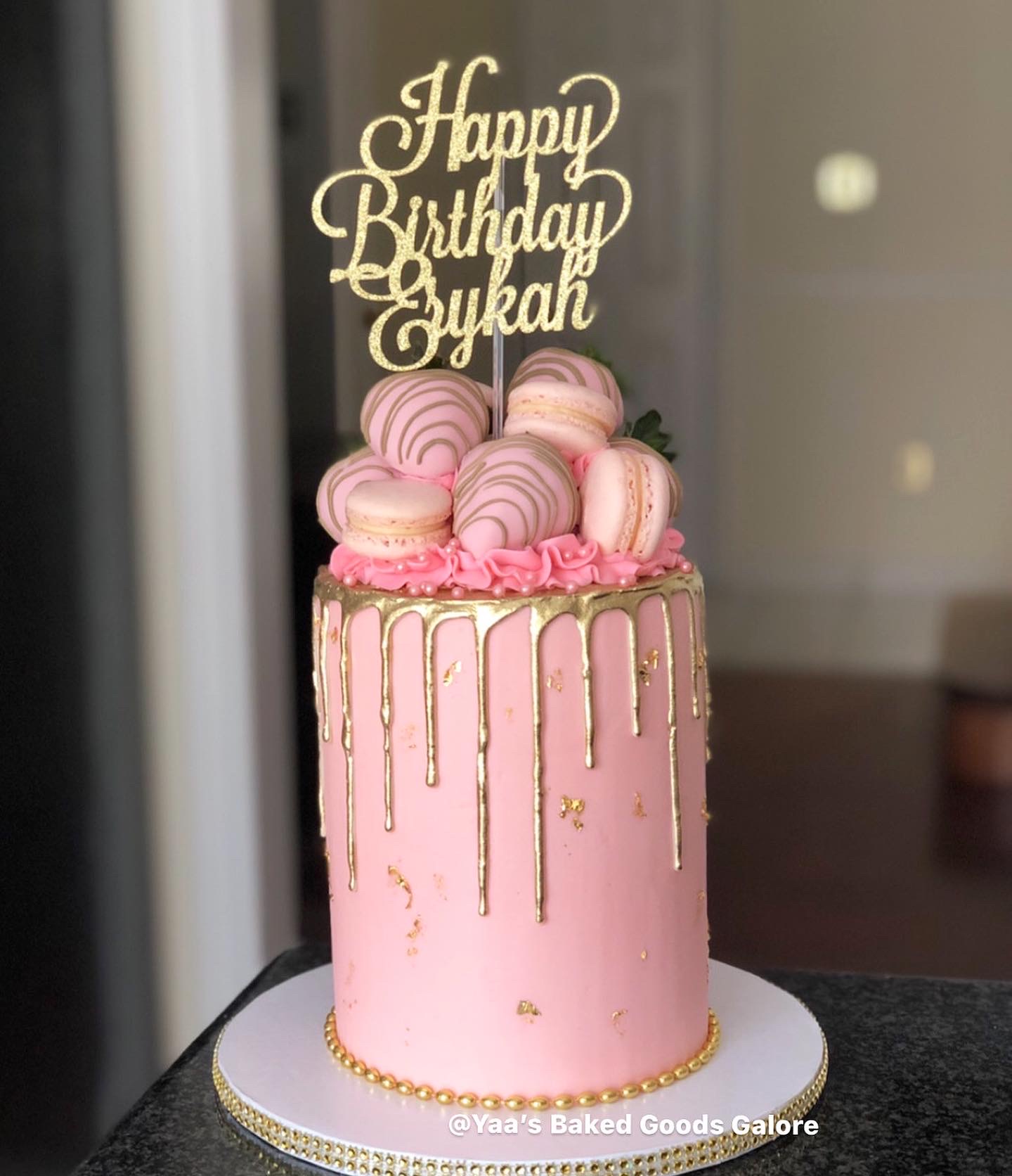 6” Vanilla drip cake with chocolate covered strawberries, macarons and hints of edible 24k gold leaf all over