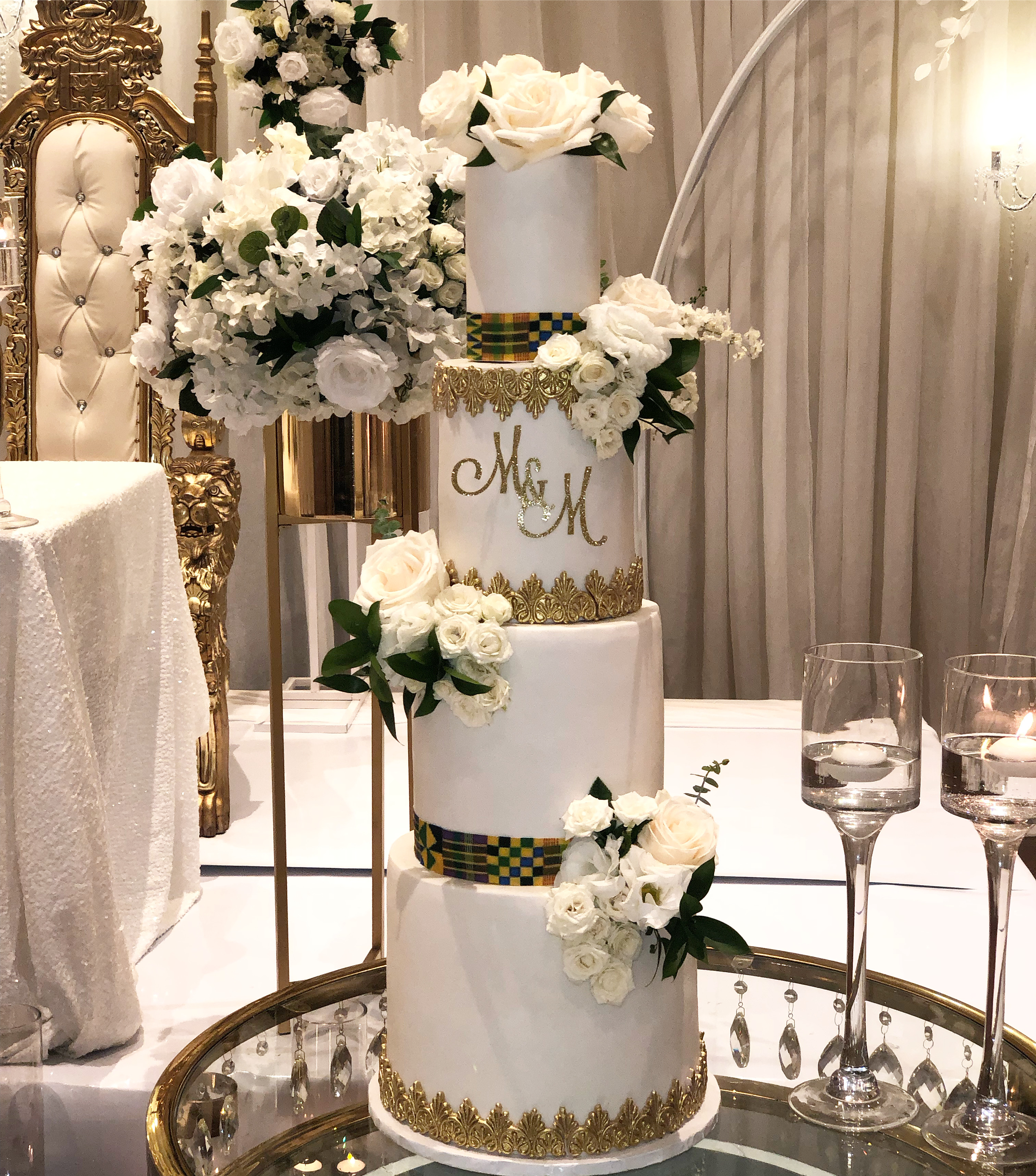 4” + 6” + 8” + 10” vanilla, red velvet and banana wedding cake