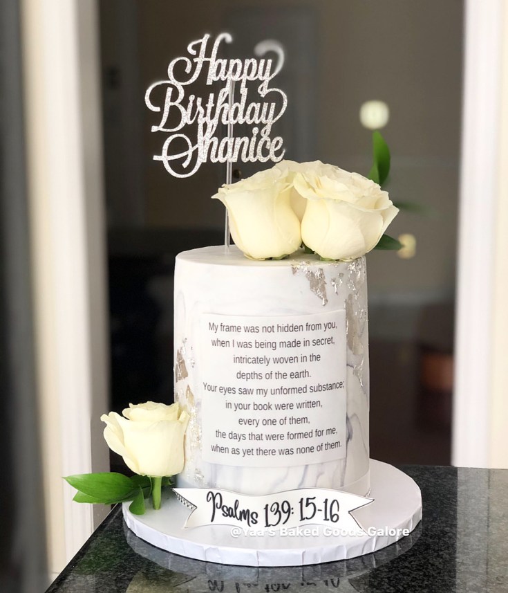 6” Vanilla marble fondant cake with silver leaf, fresh roses and greenery and a edible image of a special Bible verse in front