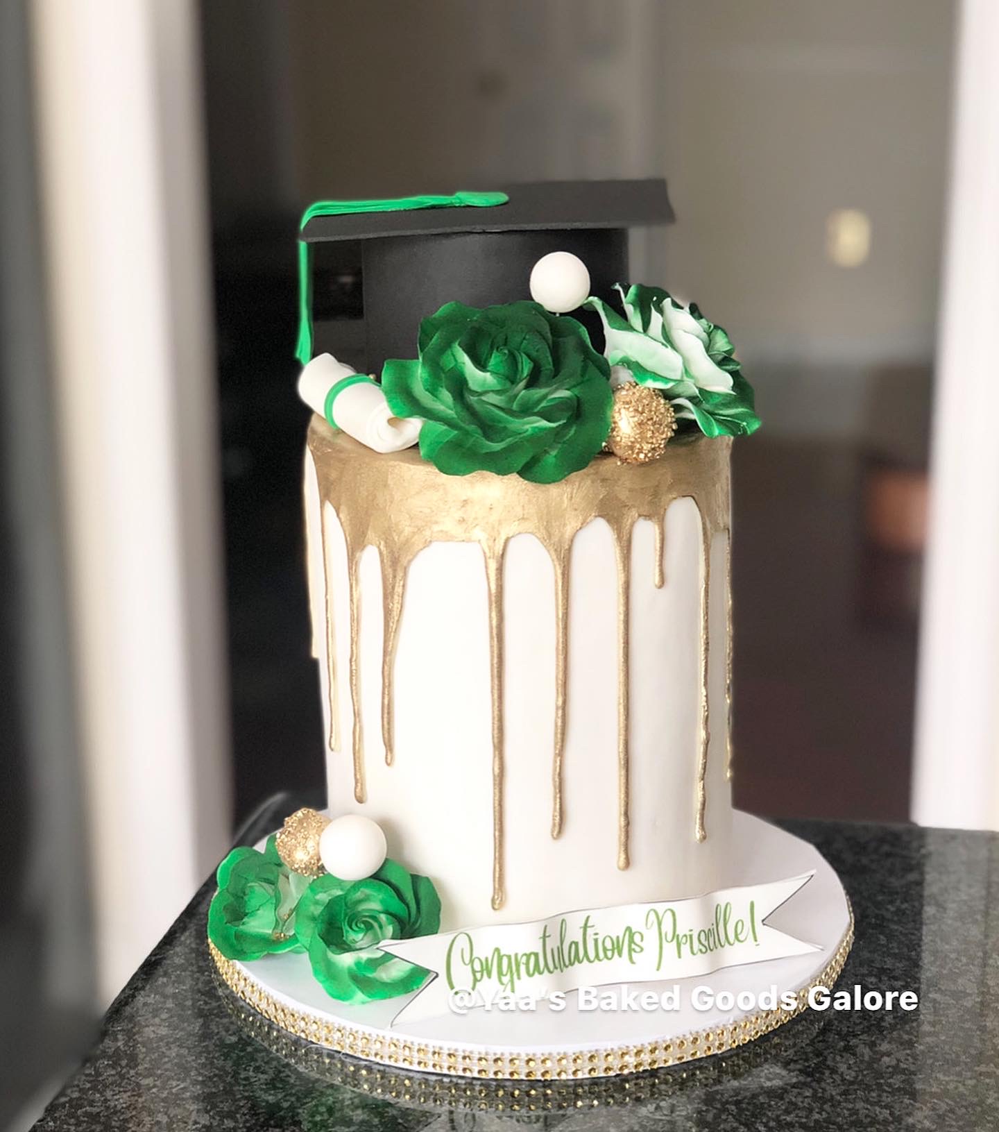 6” Vanilla graduation themed fondant drip cake with gumpaste flowers