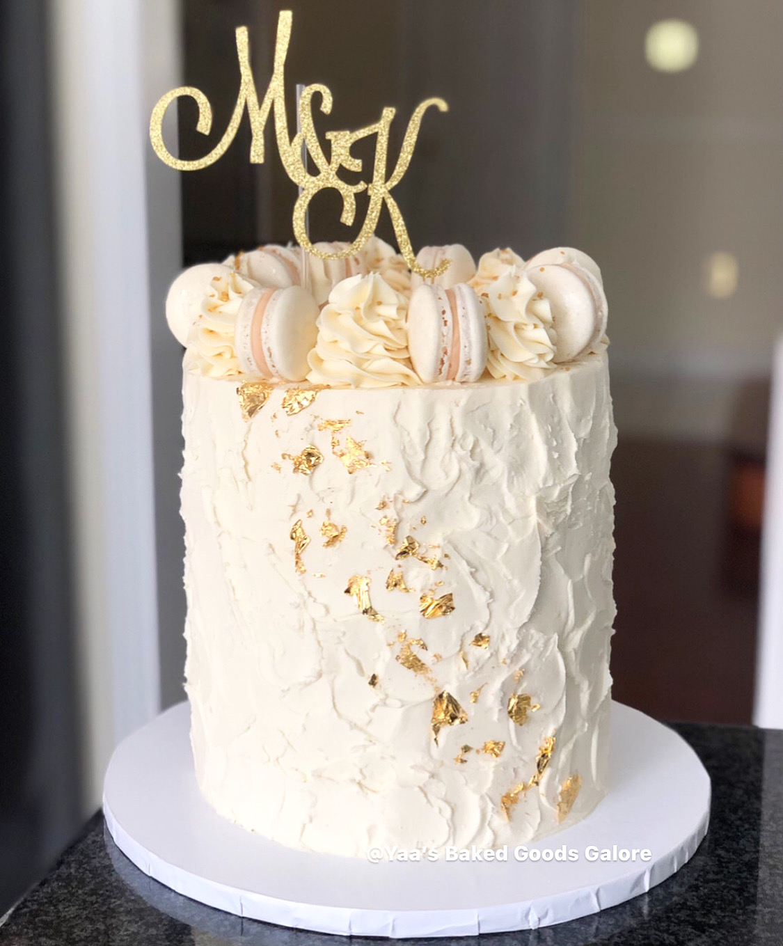 8” Vanilla and Red Velvet textured cake with macarons and edible 24k gold leaf made for a wedding