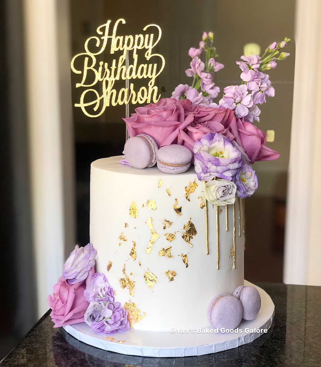 8” Vanilla marble fondant cake with hints of edible 24k gold leaf, fresh roses and macarons