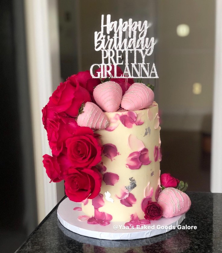 8” Red velvet freestyle fondant cake with a drip, fresh florals and edible 24k gold leaf