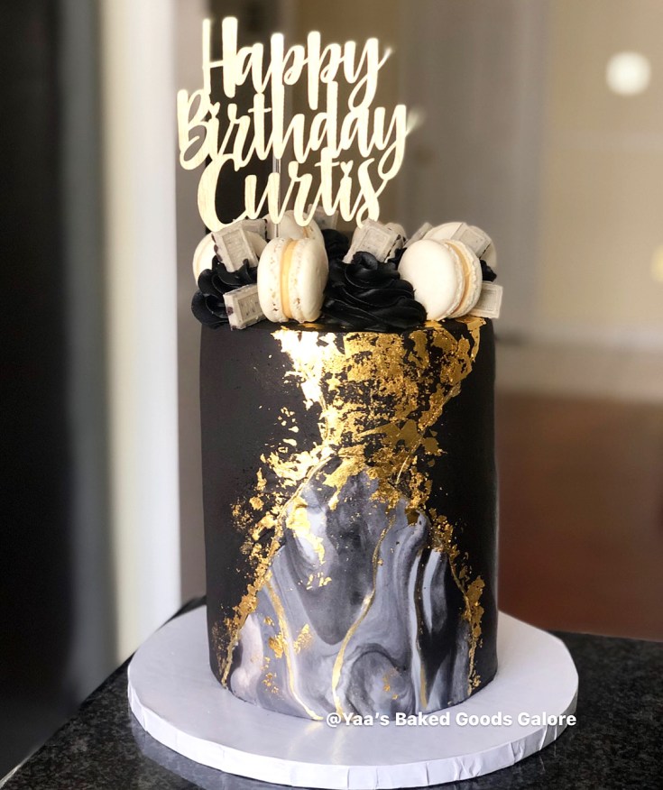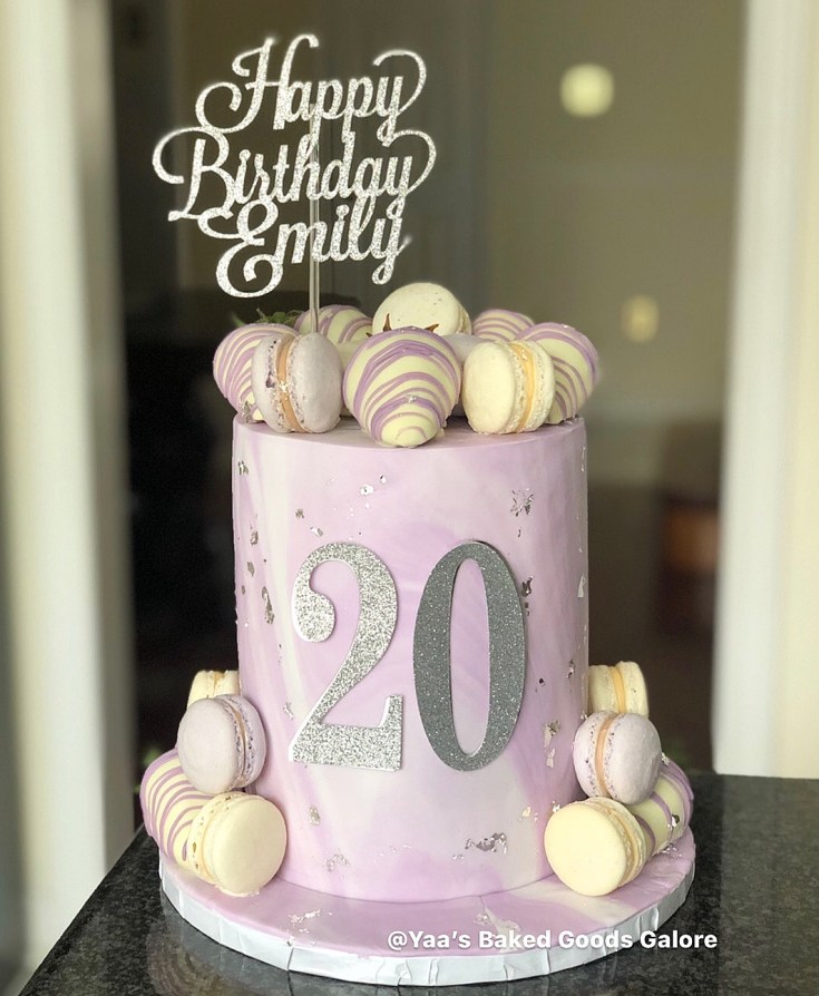 6” Vanilla and chocolate marble fondant cake with hints of silver leaf, macarons and chocolate covered strawberries