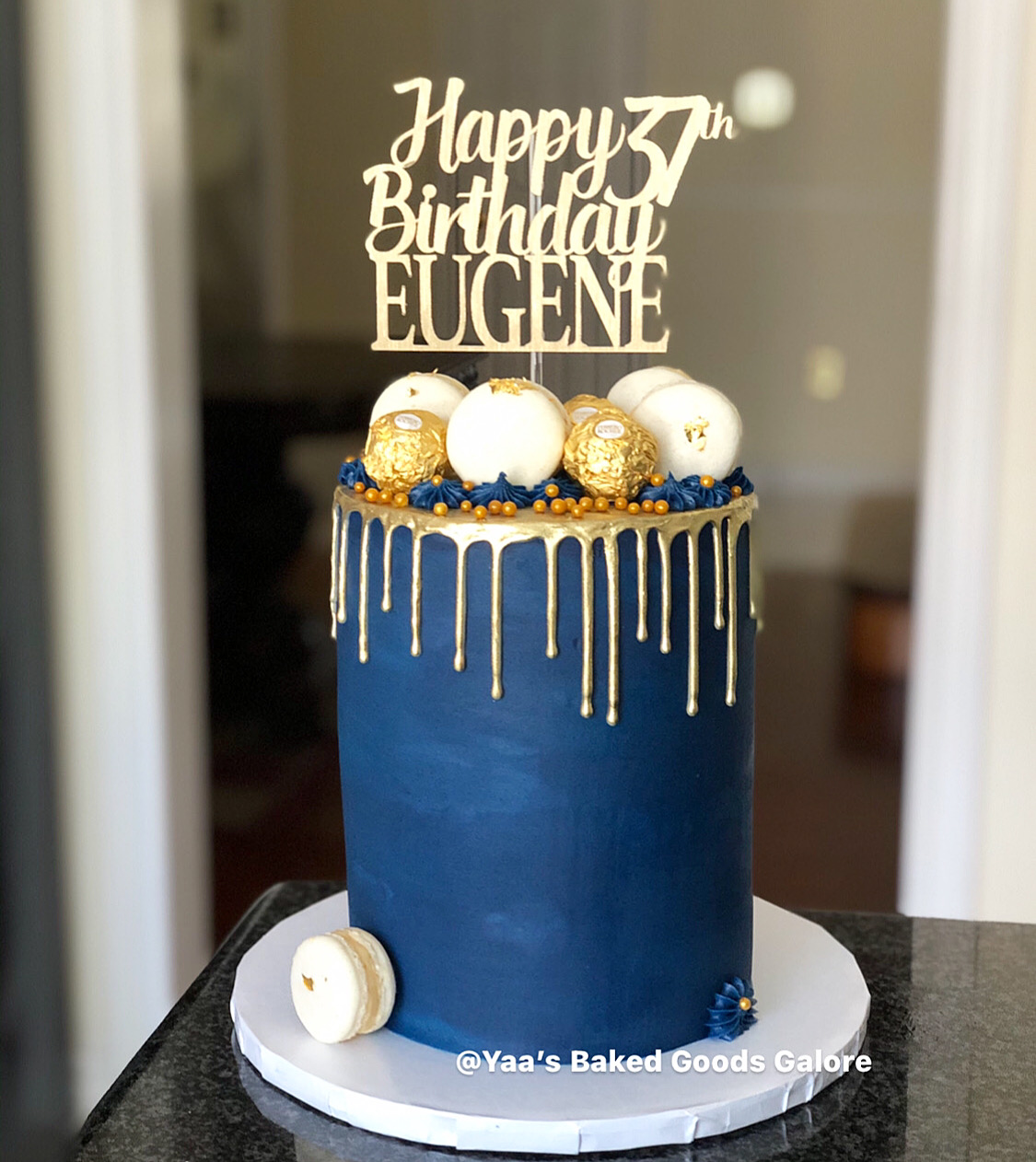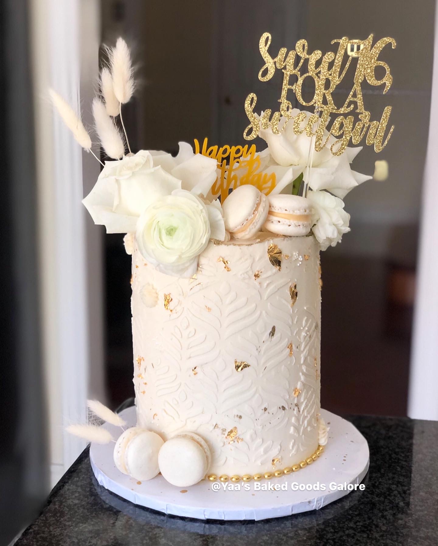 6” Vanilla drip cake with macarons, ferrero rocher, icing drops, pearls and hints of edible 24k gold leaf
