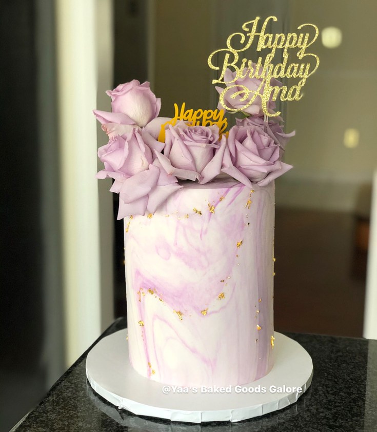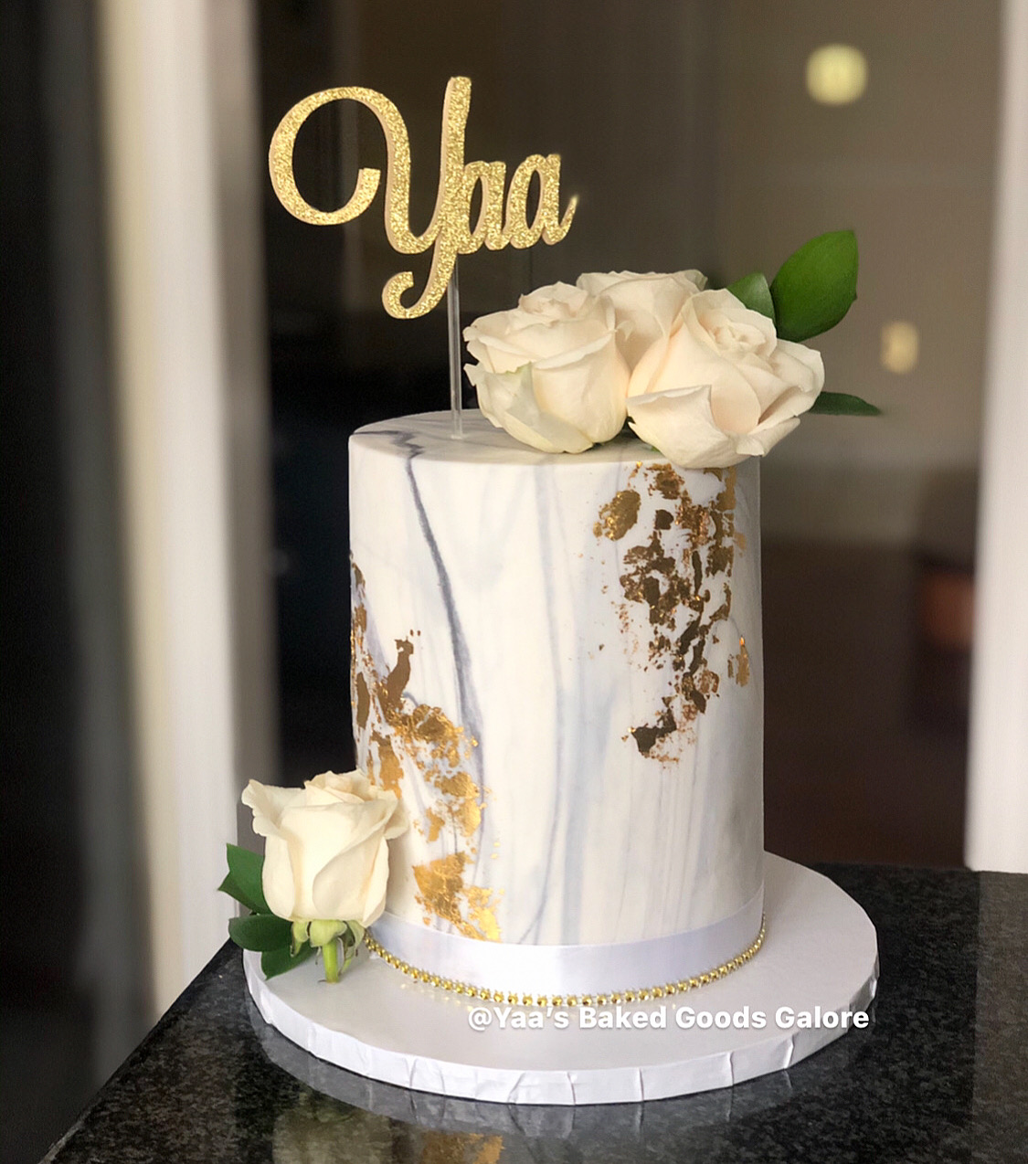 6” Vanilla marble fondant cake with hints of edible 24k gold leaf and fresh roses to match