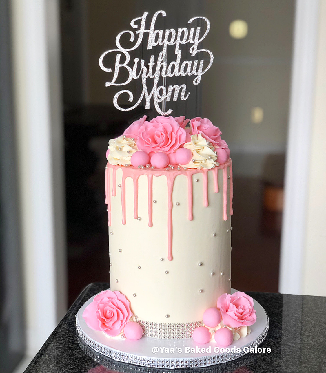 6” Vanilla and Red Velvet drip cake with handmade fondant flowers, balls, pearls and icing swirls