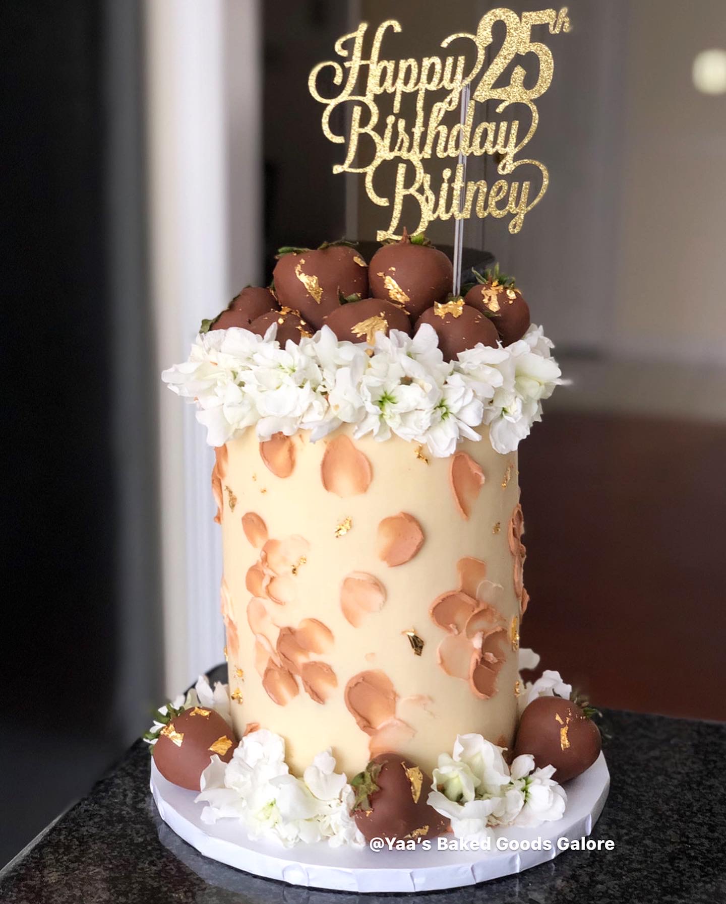 6” Vanilla and Red Velvet textured buttercream cake with fresh florals and chocolate covered strawberries