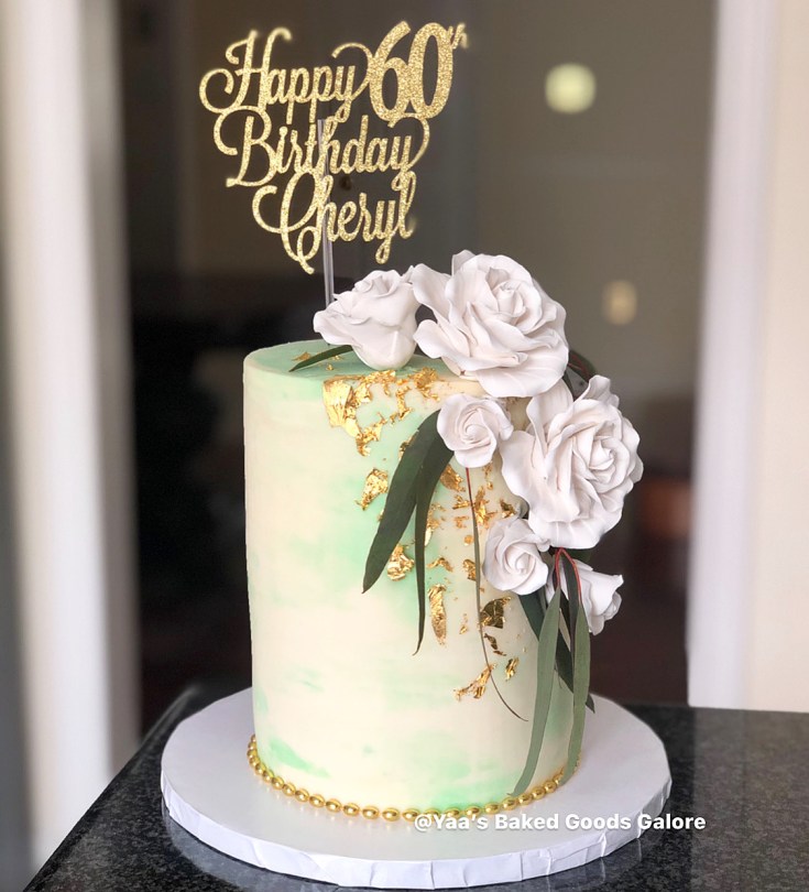 6” Vanilla and chocolate subtle watercolour buttercream cake with gumpaste flowers, greenery and 24k gold leaf