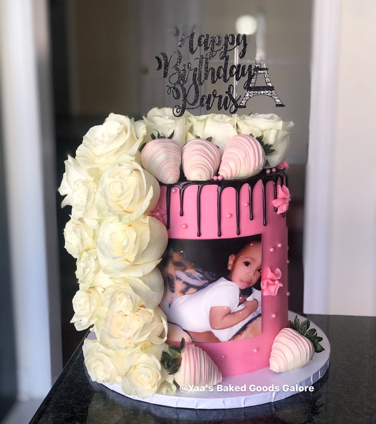 8” Vanilla and Red velvet YBGG signature design: drip cake with cascading fresh roses and chocolate covered strawberries