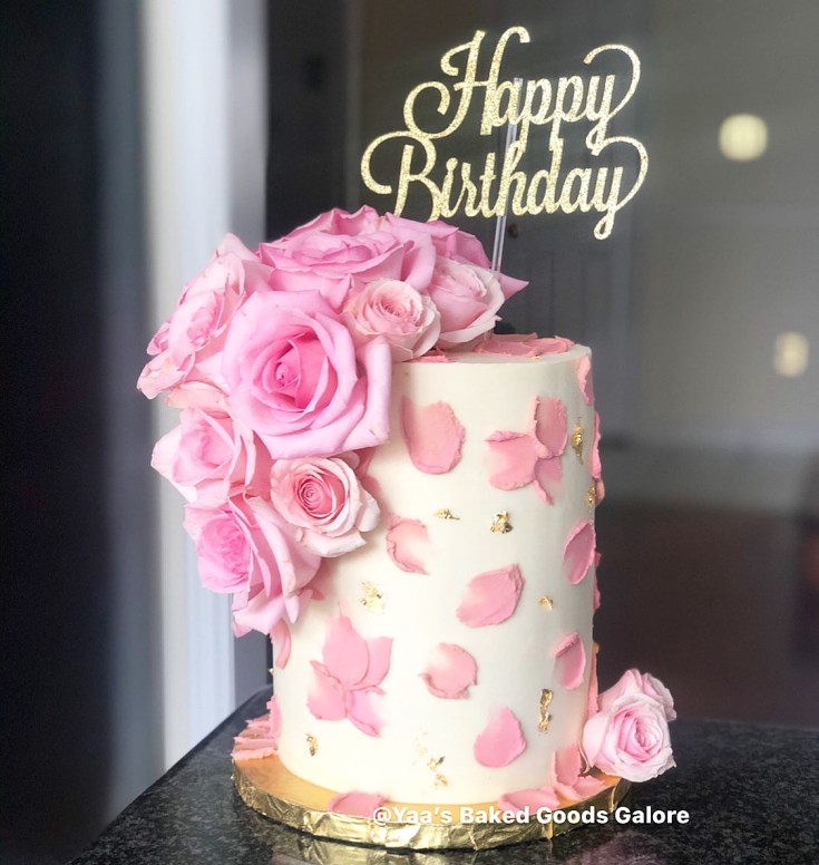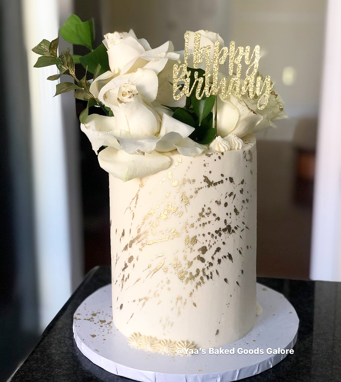6″ Vanilla and Red velvet textured icing with fresh florals and hints of edible 24k gold leaf