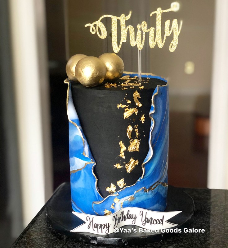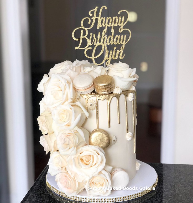 6” Vanilla drip cake with hints of edible 24k gold leaf and Wray & Nephew bottle on top