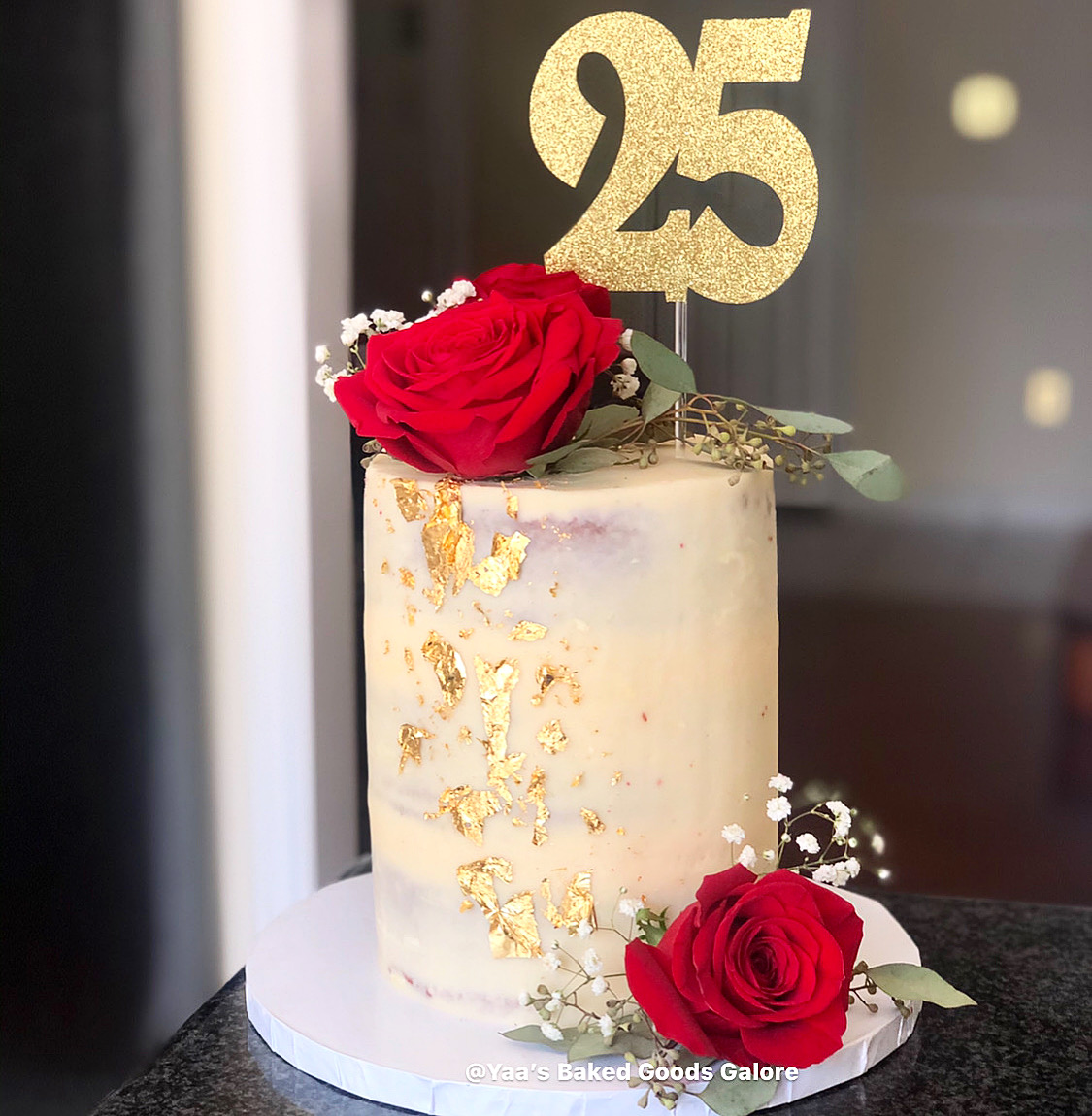 6” Red velvet semi naked cake with fresh florals and 24k gold leaf