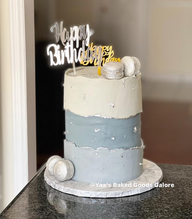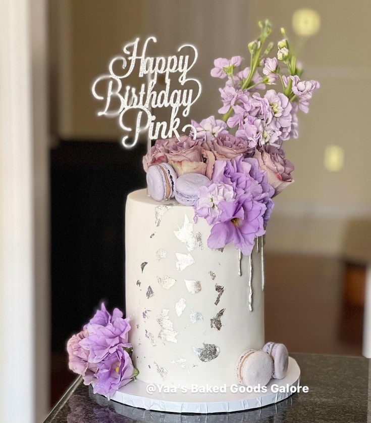 6” Vanilla fondant drip cake with silver leaf, fresh florals and a few macarons