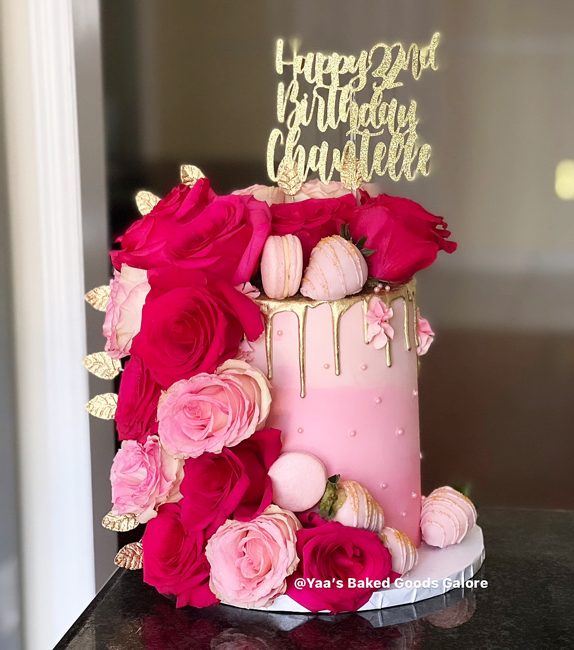 8” Vanilla drip cake with fresh roses, infused chocolate covered strawberries and macarons