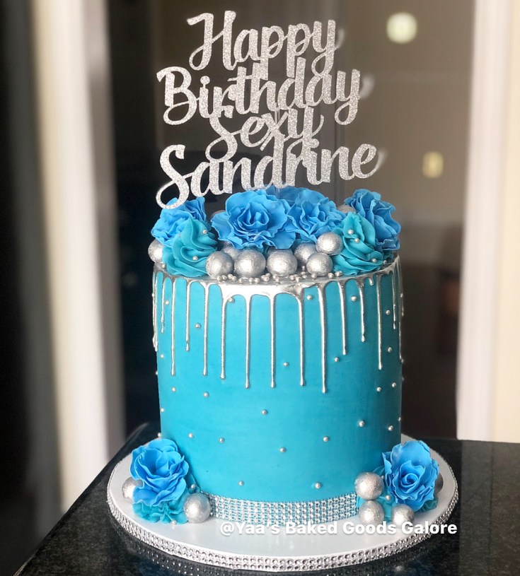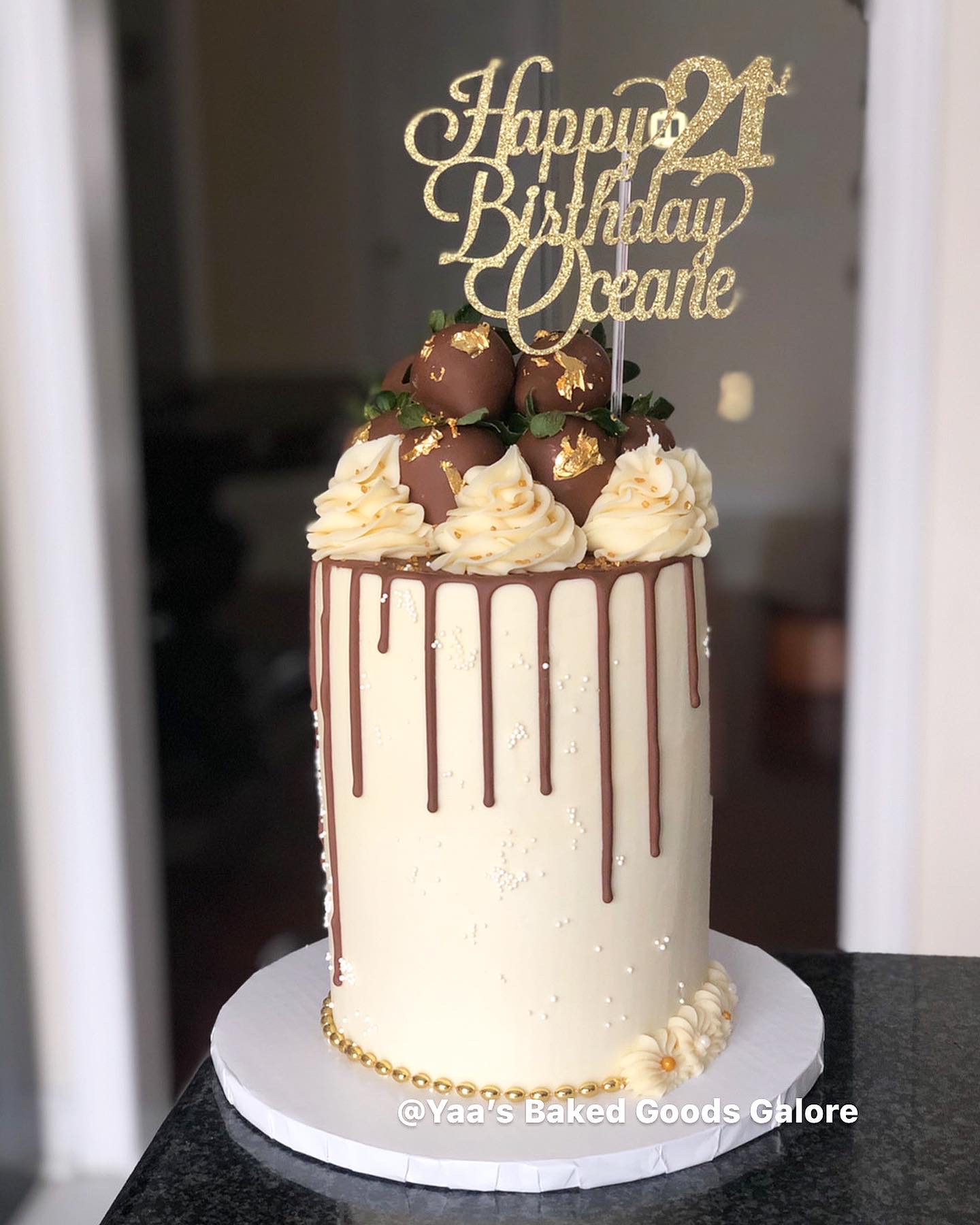 8″ Vanilla drip cake with handmade fondant flowers, balls, pearls and icing swirls