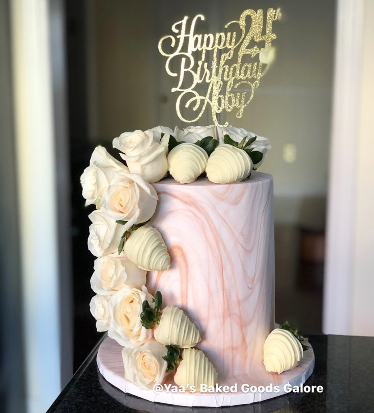 6″ Vanilla and Red Velvet marble fondant birthday cake with cascading fresh roses and chocolate covered strawberries