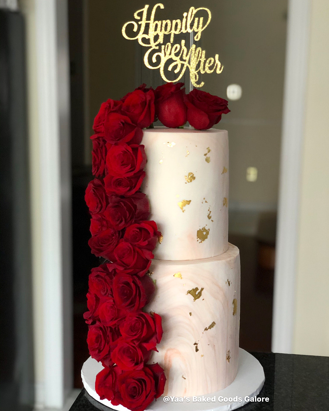 6″ + 8″ Vanilla, Chocolate and Red Velvet Engagement cake with marble fondant, edible 24k gold leaf and cascading fresh red roses