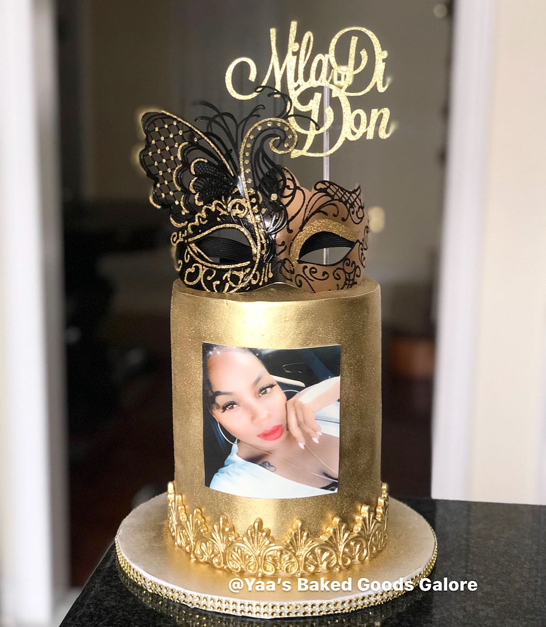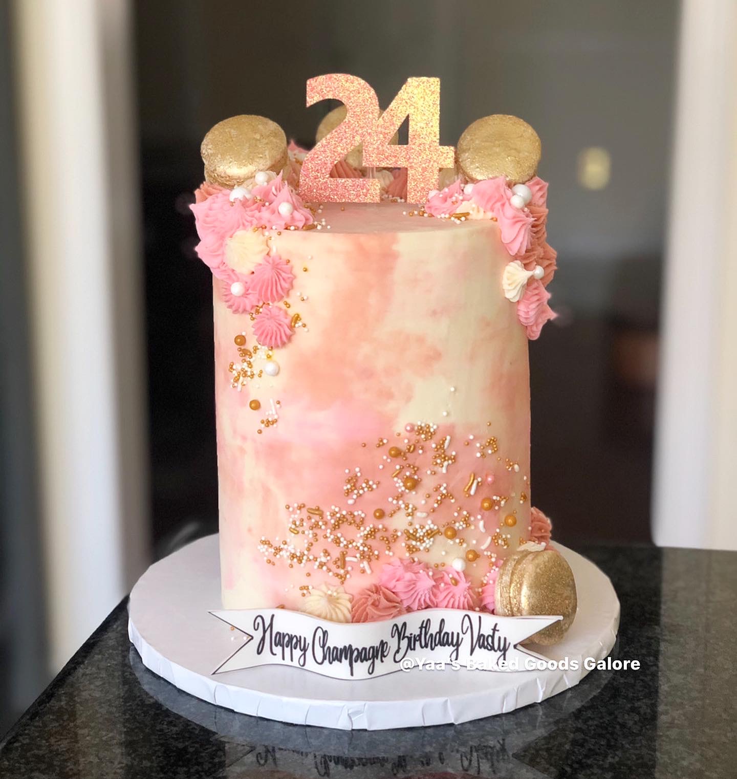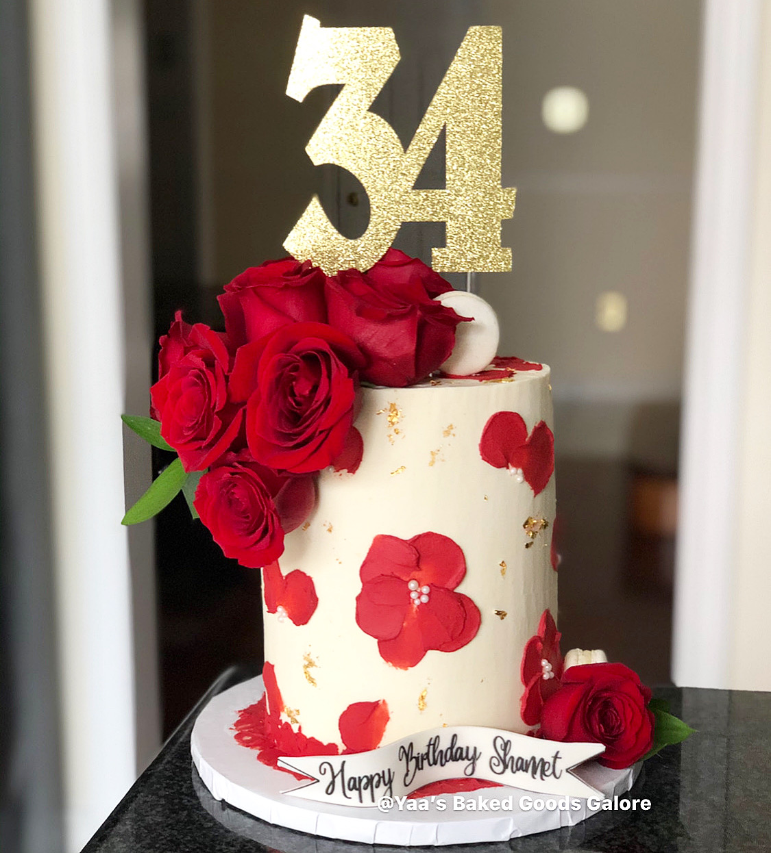 6″ Red Velvet floral design birthday cake with fresh roses, macarons and hints of edible 24k gold leaf