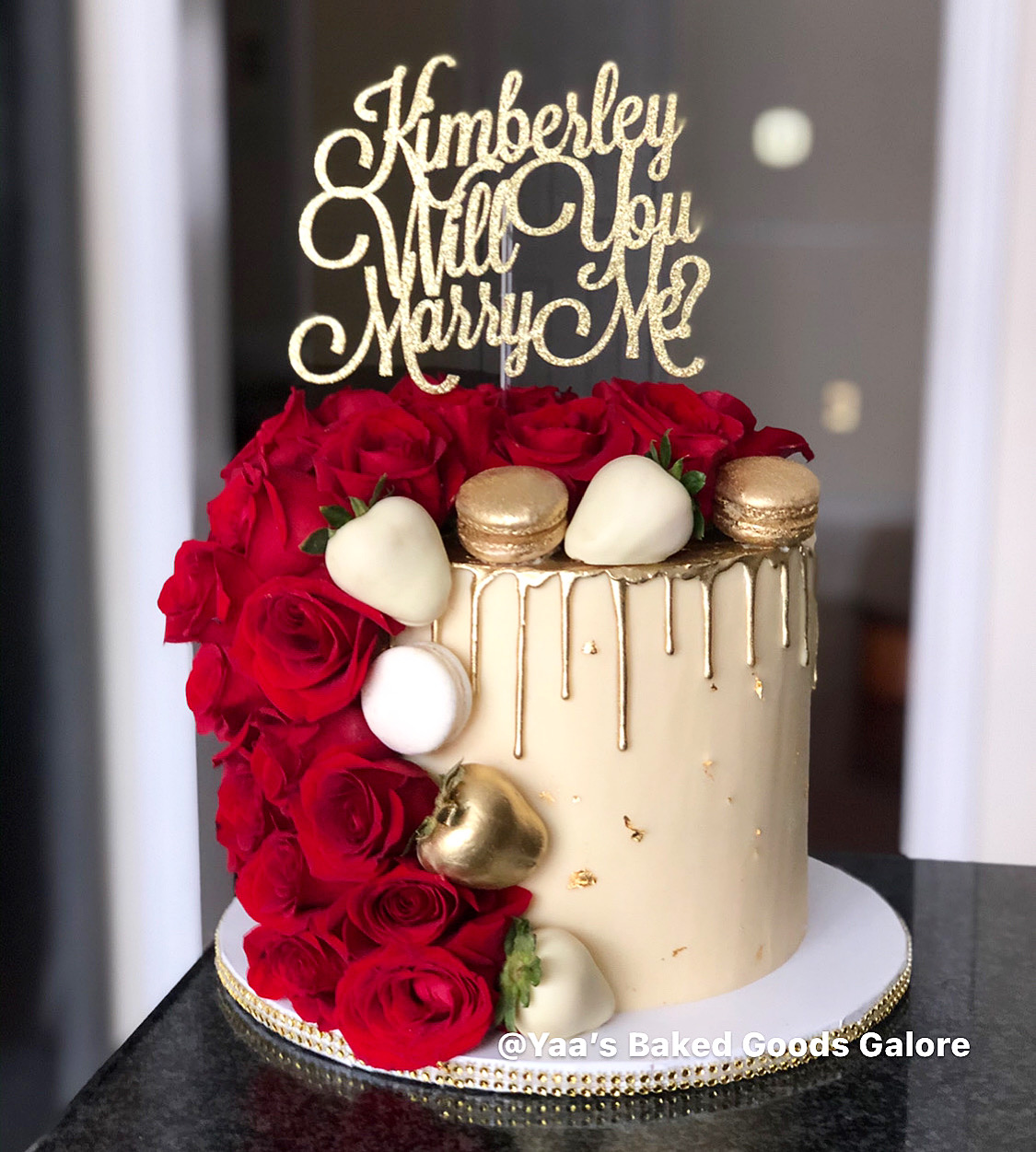 8″ Red Velvet YBGG signature design: drip cake with cascading fresh roses, macarons and chocolate covered strawberries for a proposal