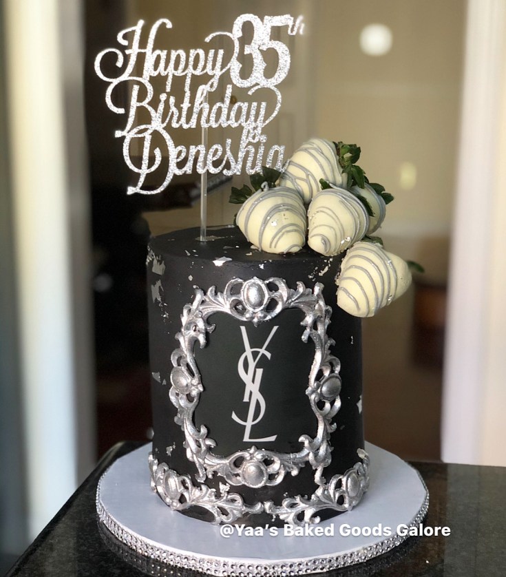 6″ Vanilla and Chocolate designer themed cake with a logo, hand painted/handmade silver borders, hints of silver leaf all over and chocolate covered strawberries
