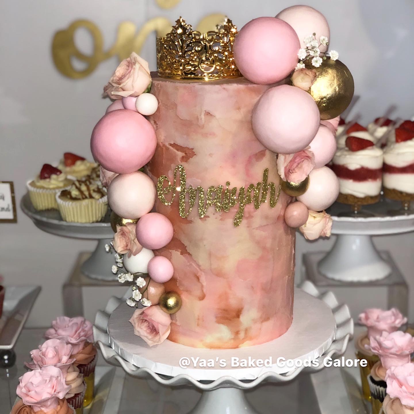 6″ 4 layer Vanilla and Red Velvet first birthday cake with textured icing, fondant balls, fresh florals and a crown