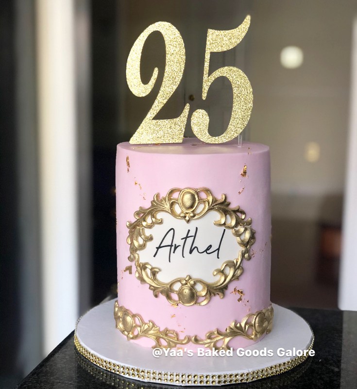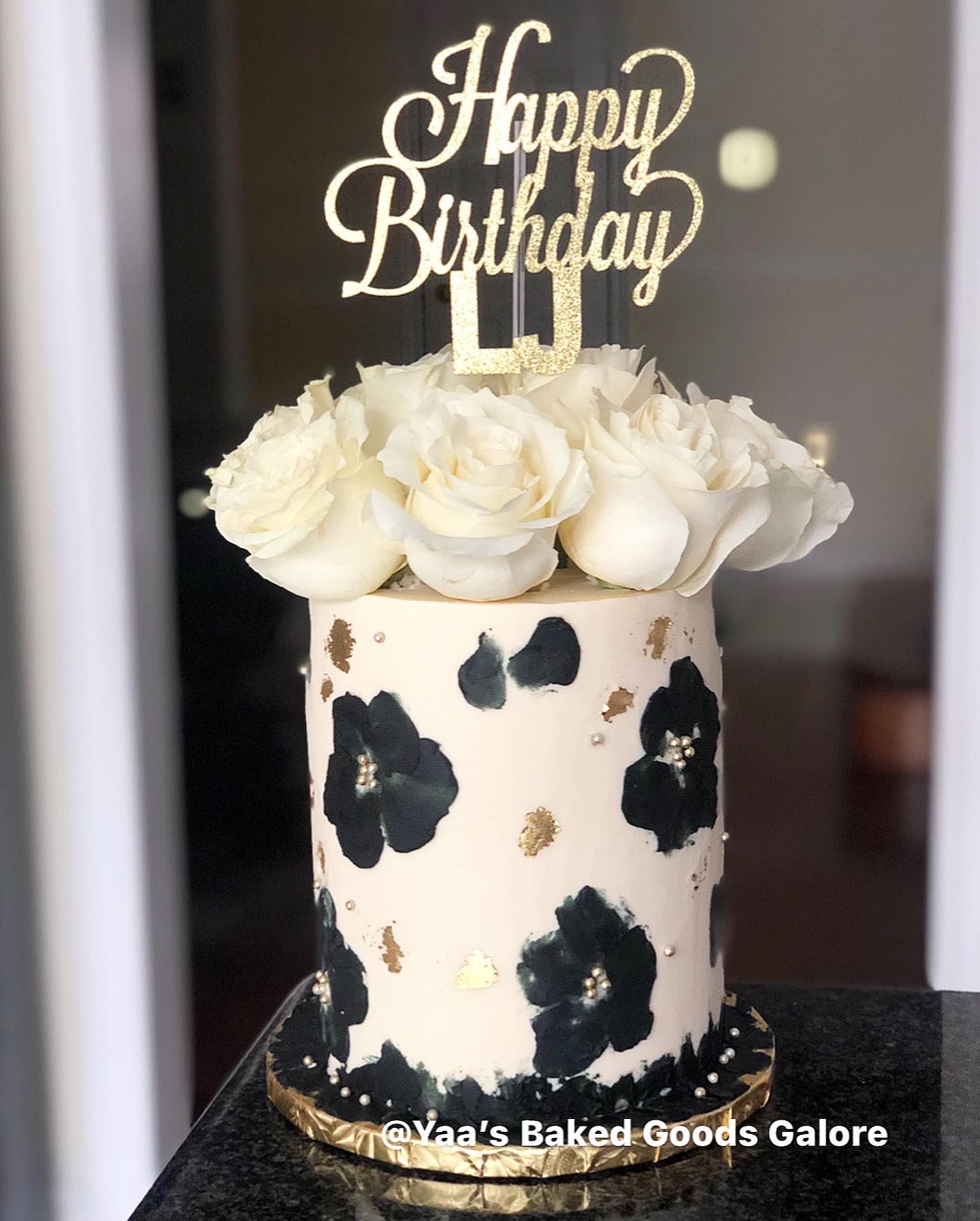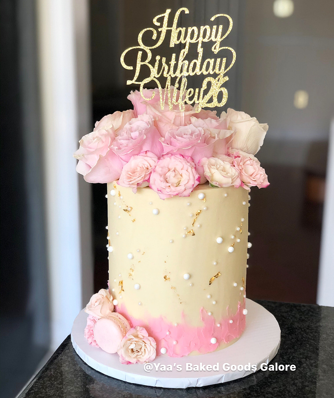 6″ Vanilla floral design birthday cake with fresh roses and hints of edible 24k gold leaf