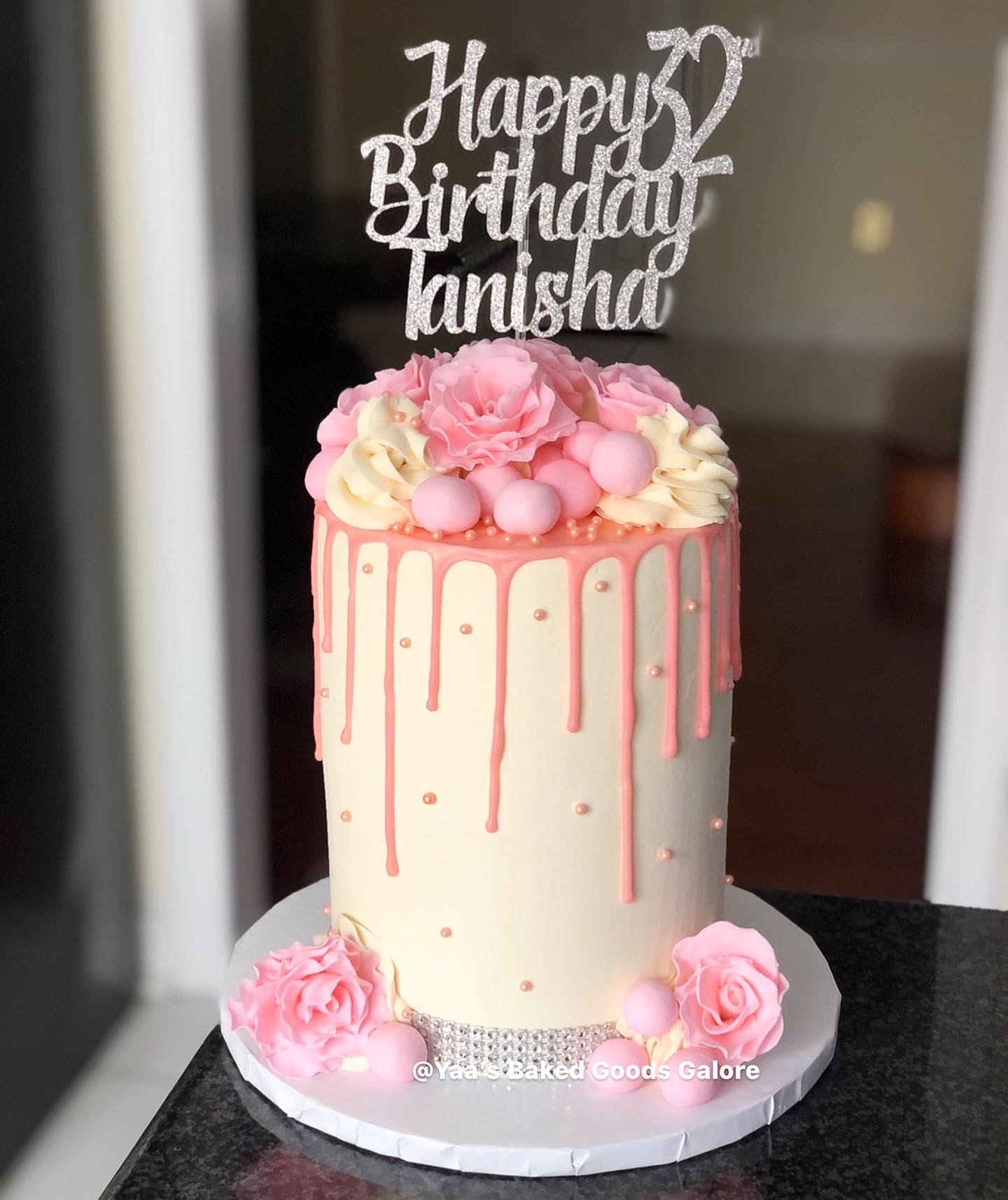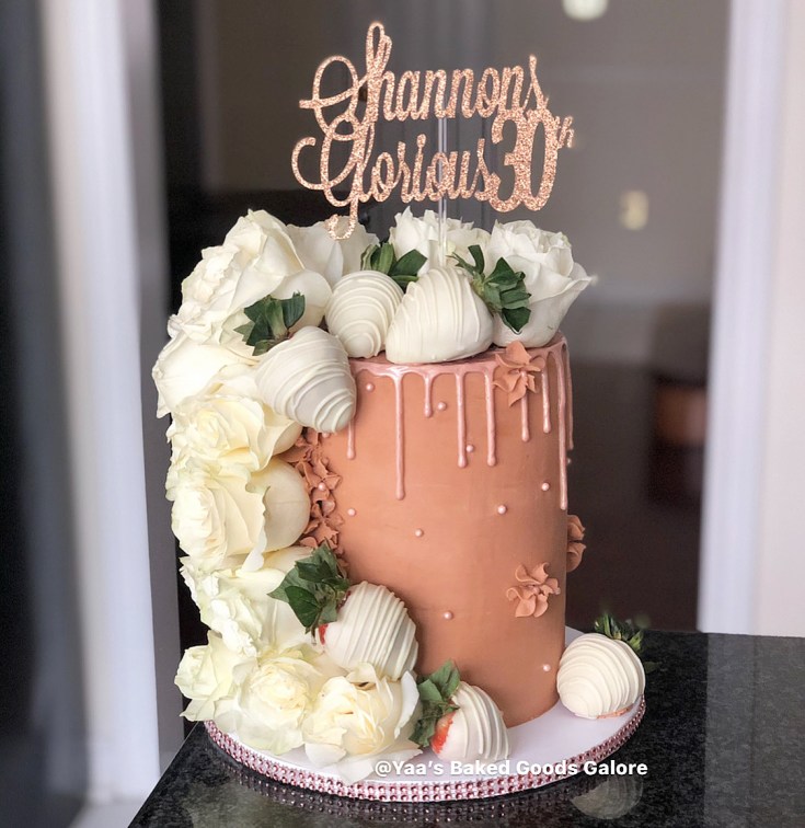 6″ Vanilla YBGG signature design: drip cake with cascading fresh roses and chocolate covered strawberries