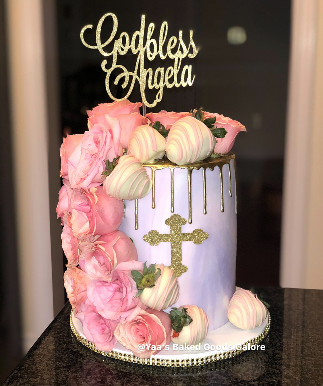 6″ Vanilla marble fondant drip cake with cascading fresh roses and chocolate covered strawberries for a Baptism