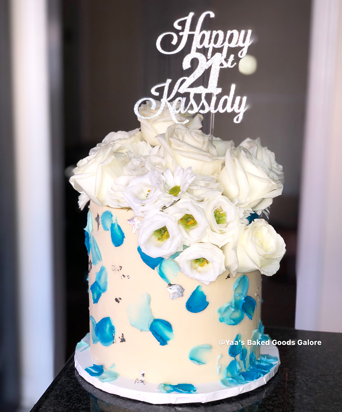8″ Vanilla textured buttercream cake with fresh florals and hints of edible silver leaf