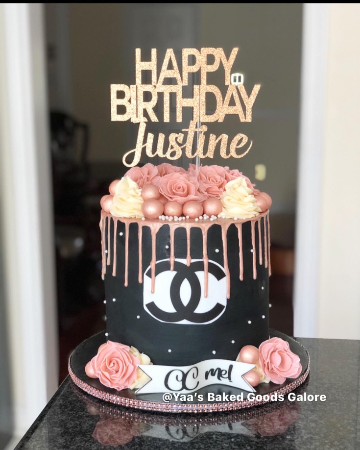 6″ Chocolate fondant birthday cake with a signature, hand painted gold borders and hints of edible 24k gold leaf all over