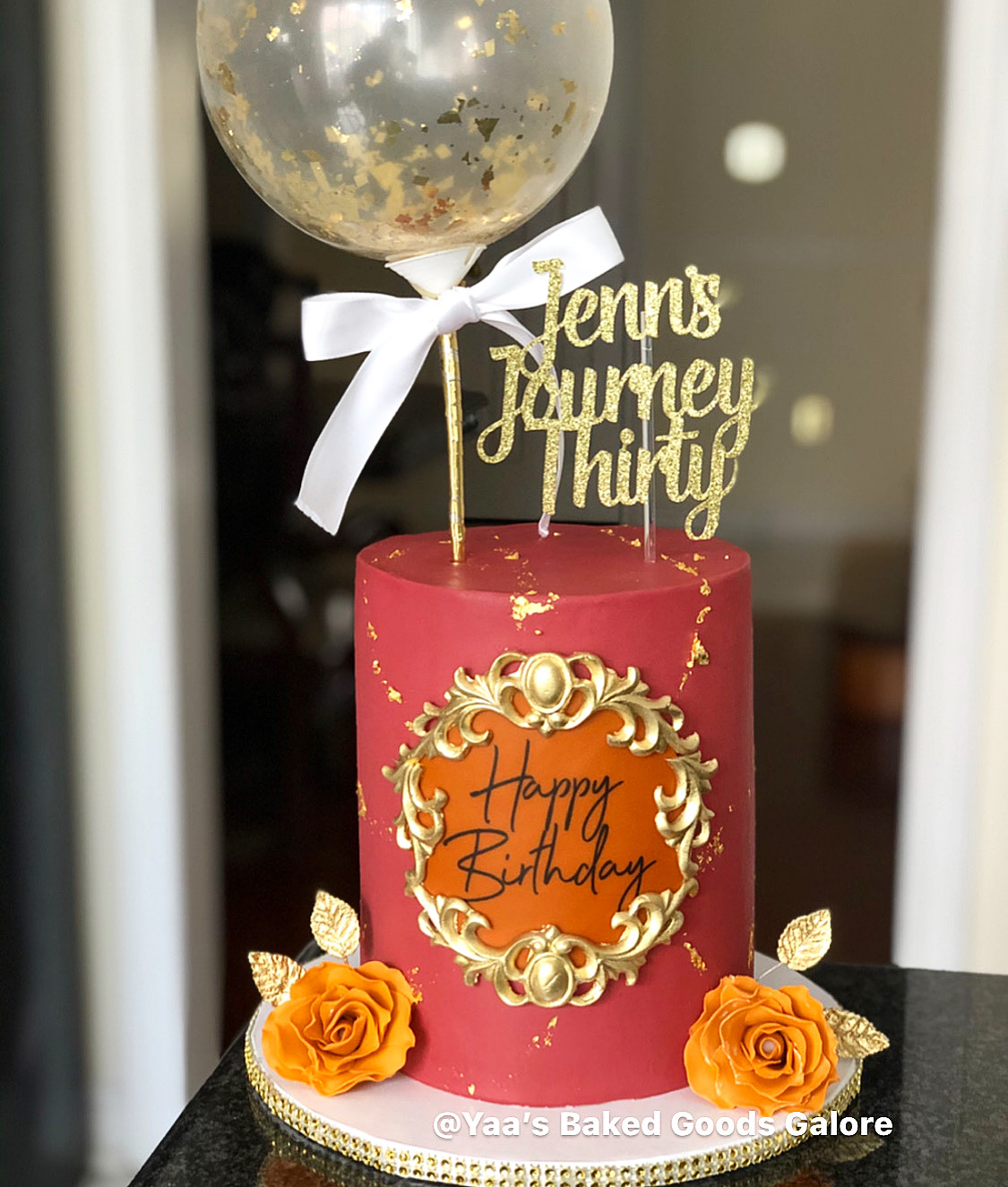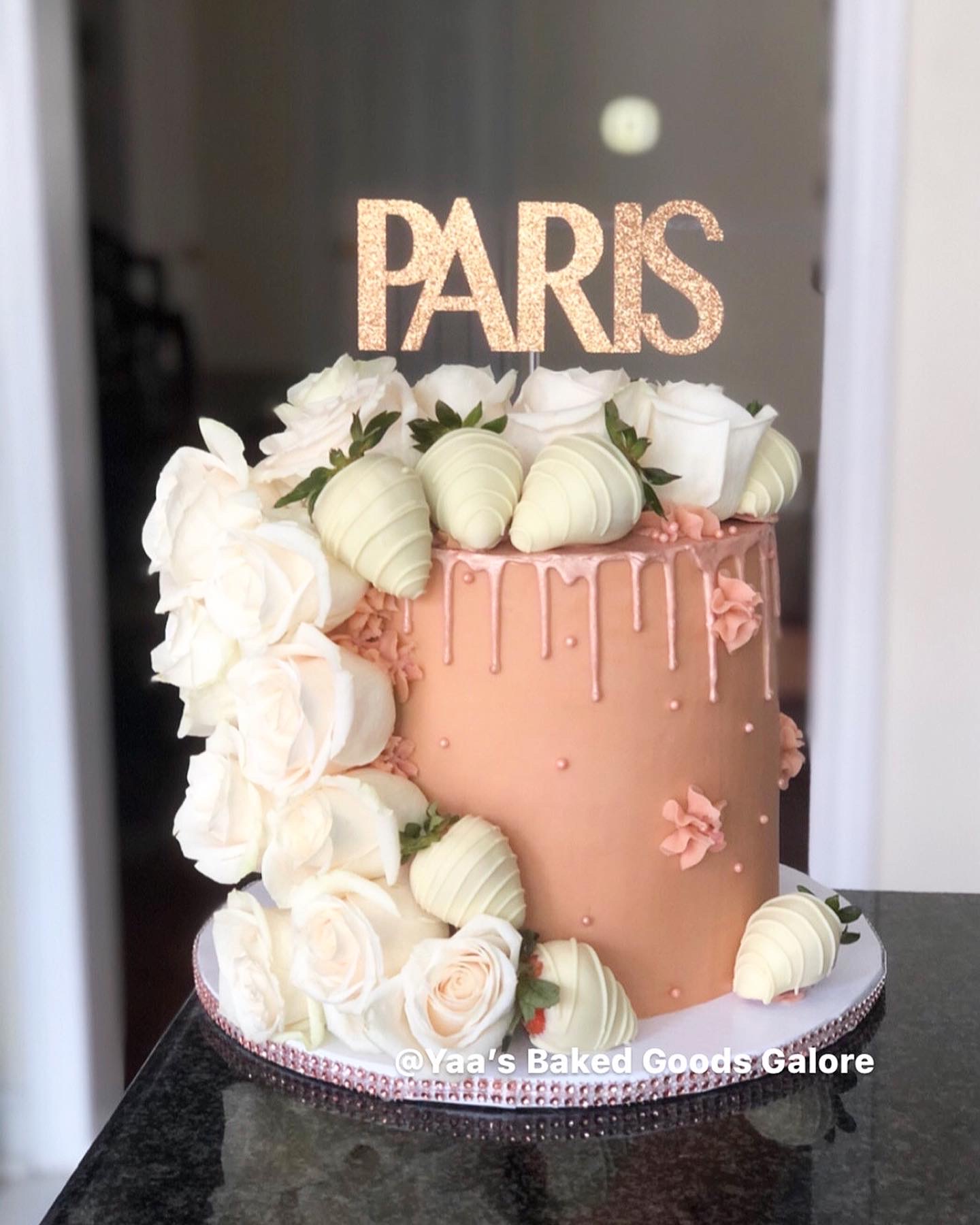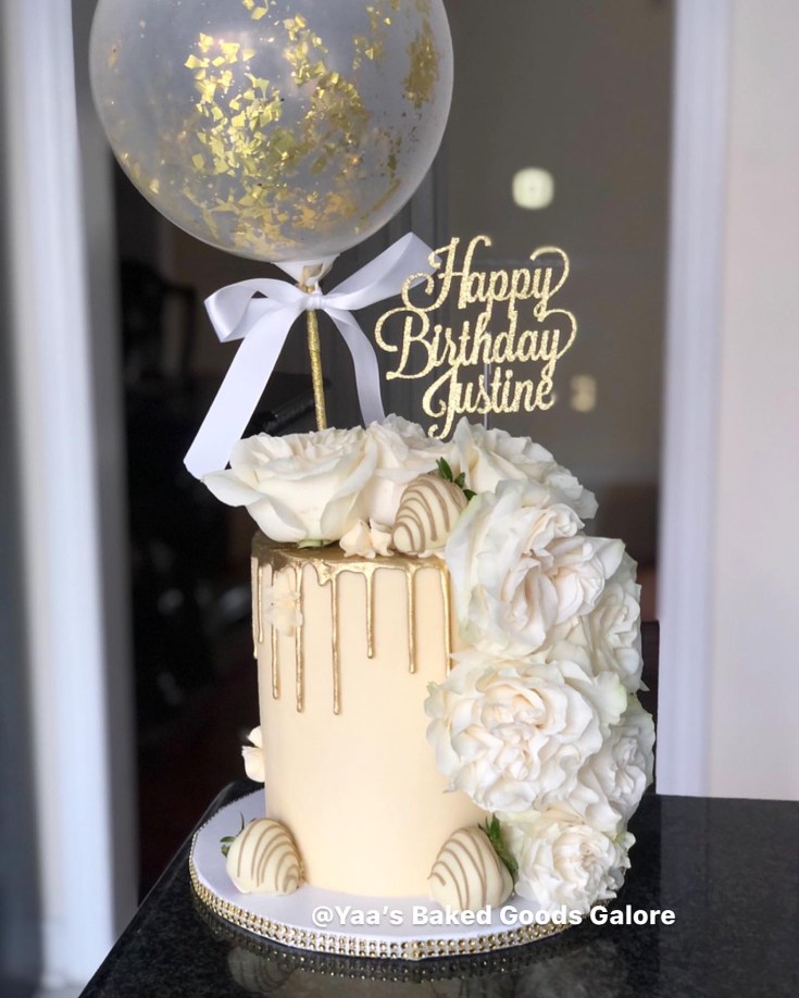 6″ Vanilla drip cake with florals, chocolate covered strawberries and a balloon cake topper