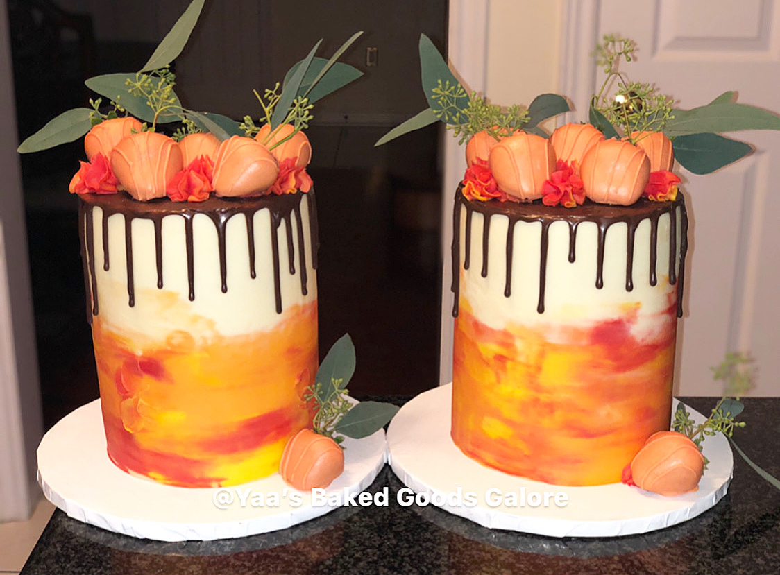 6″ Vanilla Autumn themed drip cakes with chocolate covered strawberries and leaves
