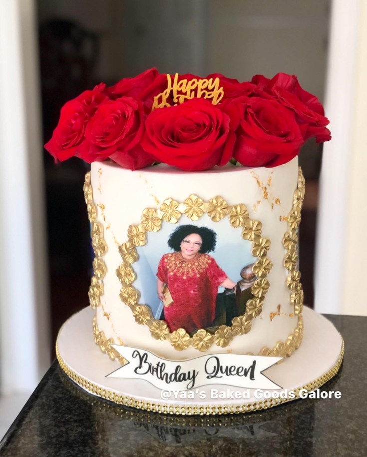 8″ Vanilla and Red Velvet fondant cake with edible images all over, handmade/hand painted gold fondant borders & fresh roses on top
